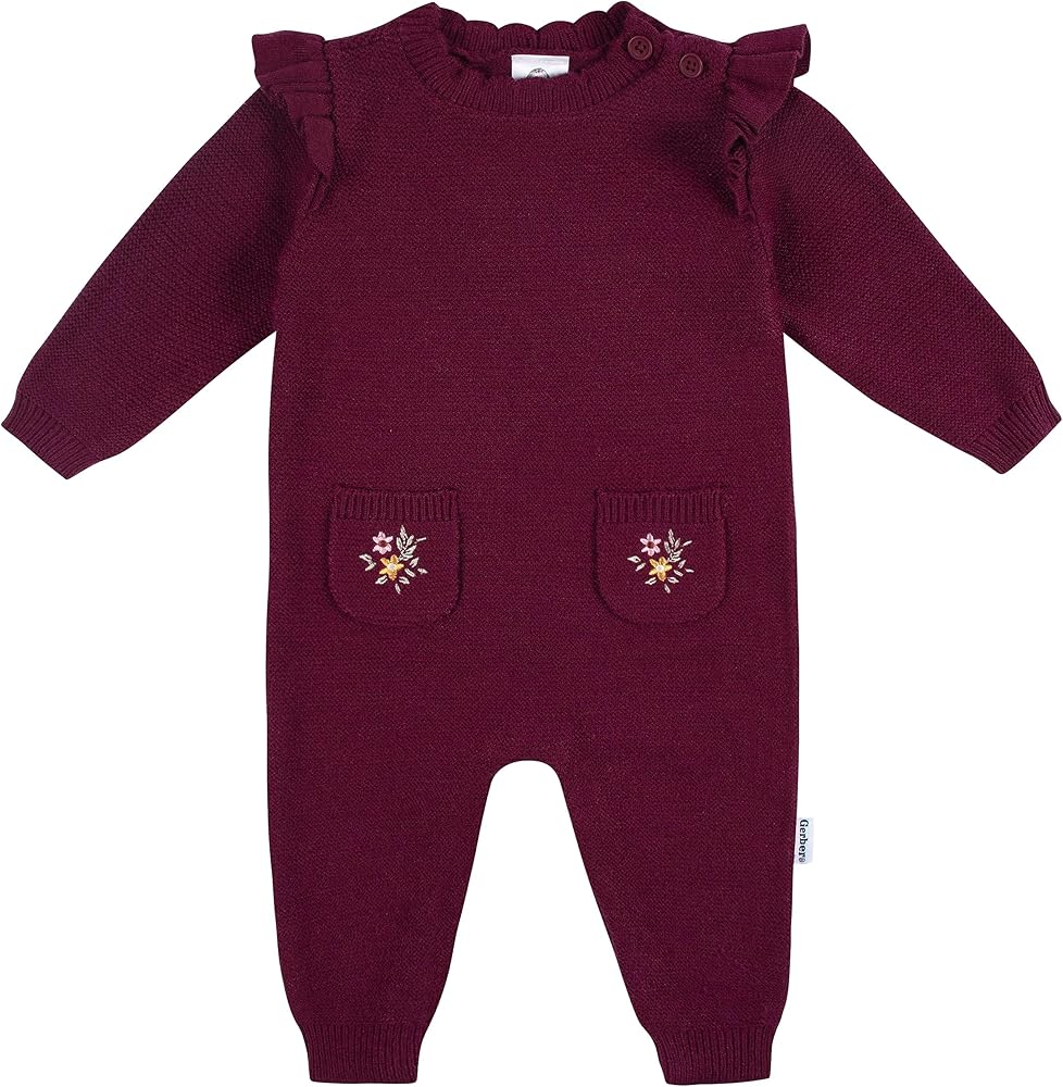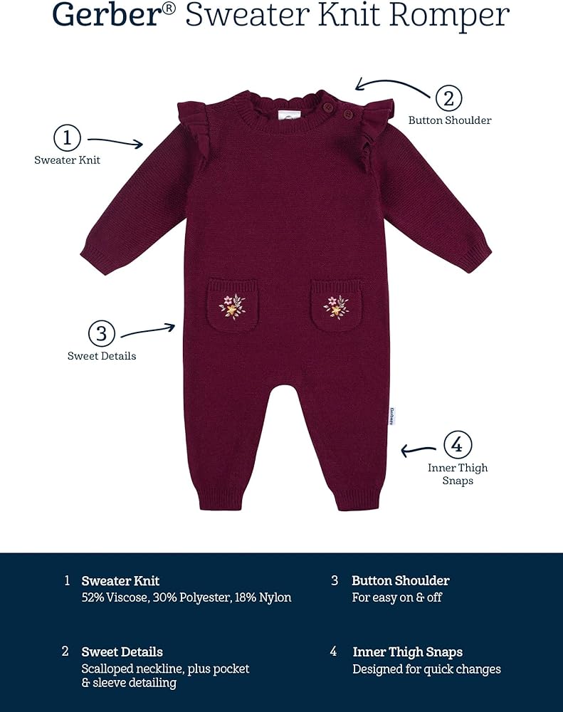 Includes one knit sweater romper. Pullover top with snaps at the legs and two shoulder buttons. Ideal for active baby boys and toddler boys with a snug fit and soft, stretchable fabric. One piece outfit makes getting ready for the day fast and easy. Two decorative front pockets. Independently certified with STANDARD 100 by OEKO-TEX® to ensure harmful substances are not present. Made from 52% Viscose, 30% Polyester, 18% Nylon. Machine wash and tumble dry.