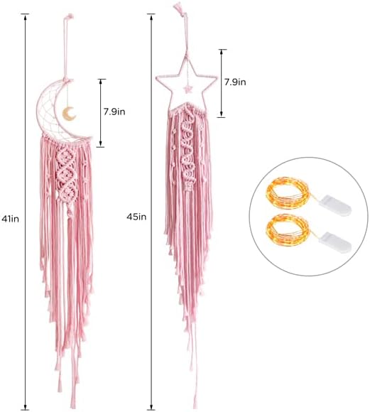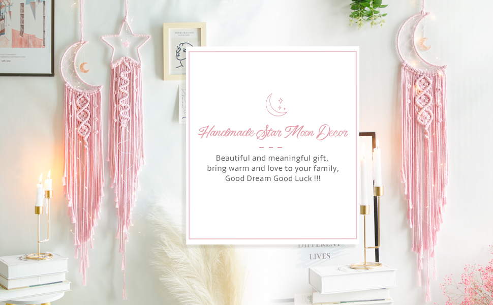 🌙【PINK STAR MOON DREAM CATCHER】Dream Catcher represents a beautiful blessing, primitive, warm and mysterious.Dream catcher has the meaning of praying for peace and bringing good luck. It hangs in the children's room, home, It will bring you good luck, and can drive away nightmares, It brings people to sweet dreams. It can also be hung on the car for good luck!
