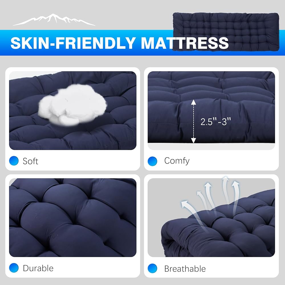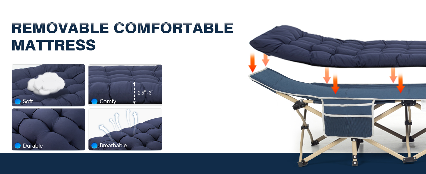 Unmatched Comfort: Overmont camping cot is expertly crafted for unparalleled comfort. Its resilient fabric and skin-friendly cotton mattress provide a sleeping experience akin to your own bedroom bed. Our cot and cotton mattress are detachable, ensuring year-round usability, adapting effortlessly to every season.
