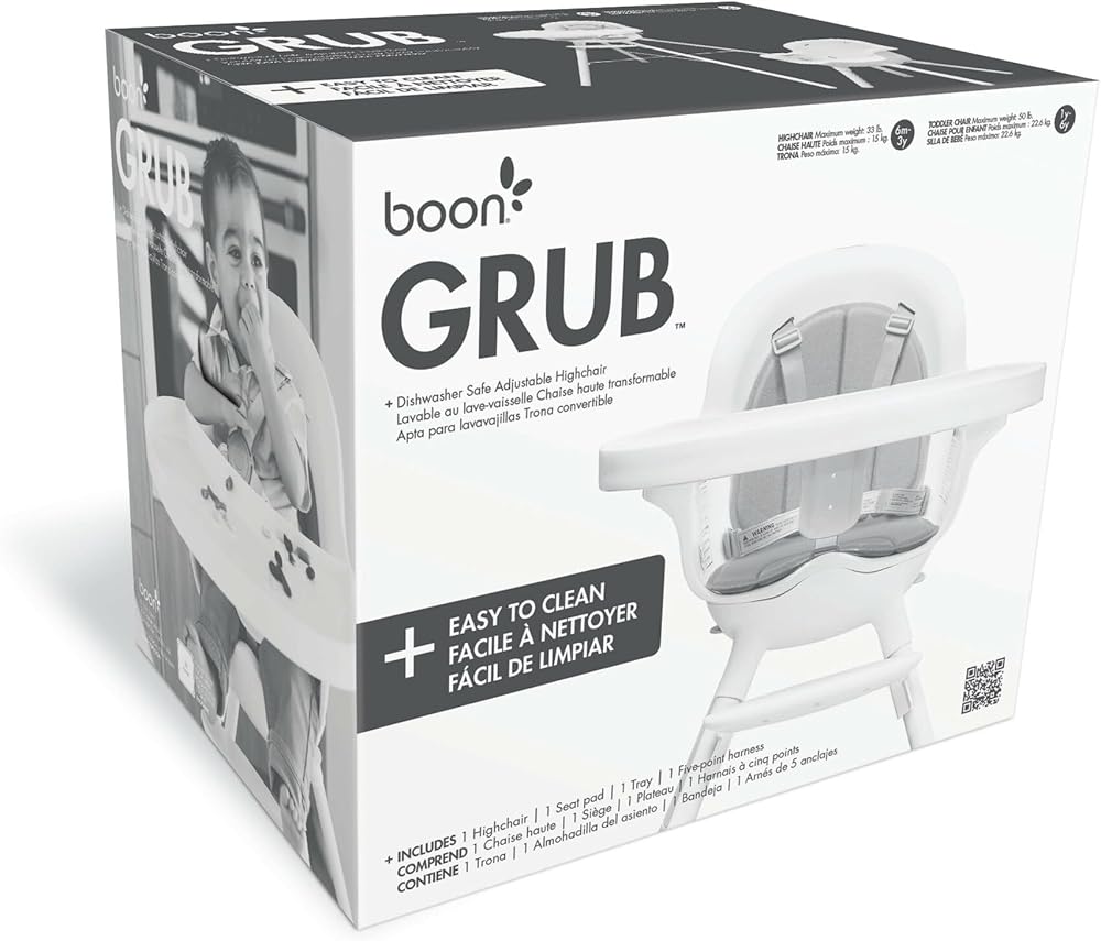 Did you hear the news? The Boon Grub Baby High Chair is now even better! The seat pad hugs GRUB to keep little bums comfier and the tray features updated buttons on the side. Easy to see, use, and remove! And the Grub is still sleek in style with the features you really WANT from baby furniture. Easy to clean? We got you covered. There's no need to scrub Grub. The whole seat removes for a really easy clean in the dishwasher. The tray and seat pad are also easy to wash since they're both machine friendly. The Grub convertible high chair for toddlers and infants is designed to make mealtime as convenient as possible with a built-in storage hook to hang clean bibs for when they're ready to dig in to mealtime. The adjustable height is perfect for eating at the dinner table or at the counter. It also grows with your child with an updated adjustable tray that's easy to move and remove with side buttons. Along with the 5-position footrest, it's easy to get a custom fit that is perfect for kiddo comfort. The new seat pad also hugs the chair for a slip-free seat. And best yet, when your toddler is ready to leave the baby highchair behind, Grub transforms into the perfect toddler chair that'll last after those baby bib days are done. (Did we mention this highchair has a handy bib hook too? Yep, built right in.) What are you waiting for? Get Grub!
