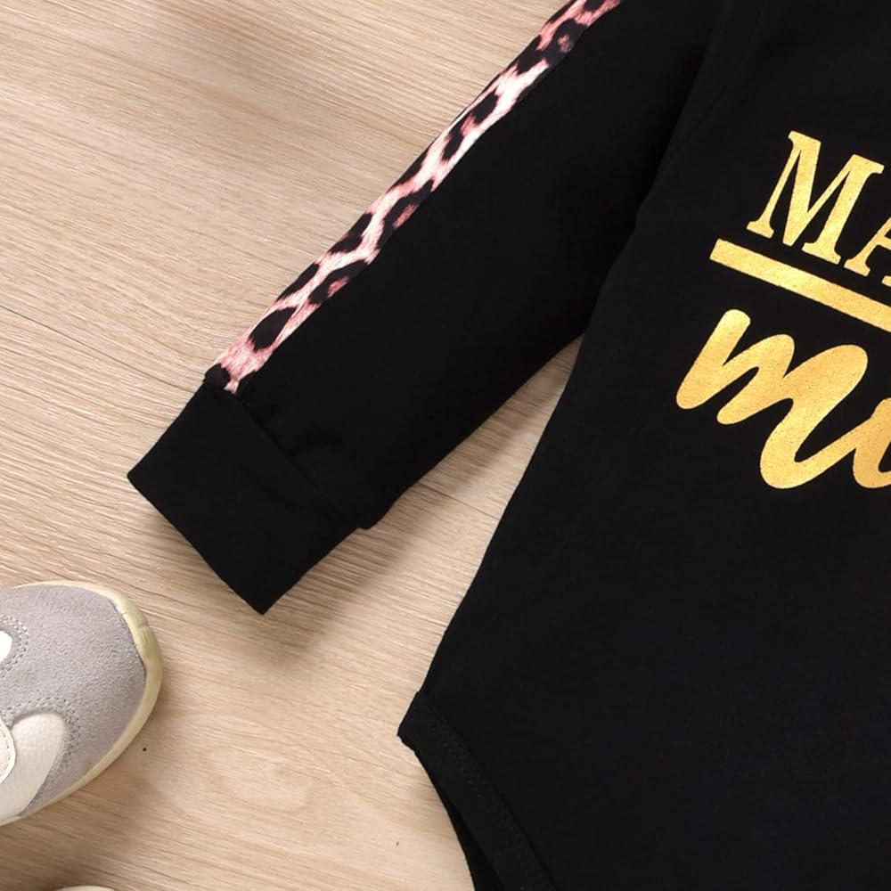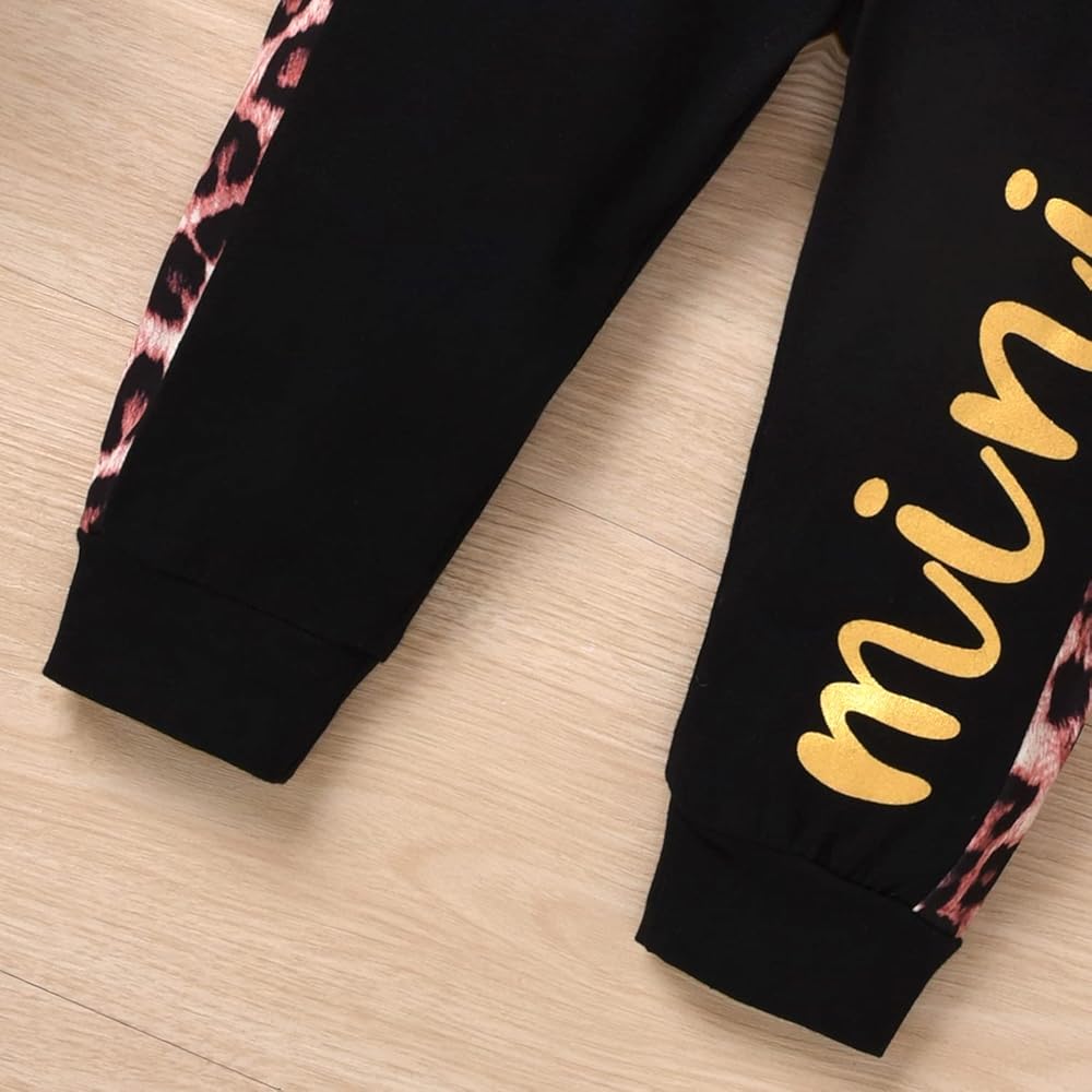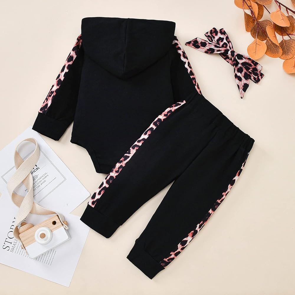 Design of infant girl hoodie romper sweatsuit: Sweet letter printing top is lovely. Leopard stitching hooded sweatshirt looks more adorable. Snap buttons design on baby girl onesie top with hood is convenient for changing diapers. Elastic waistband sweatpants, it's easy to put on and take off.