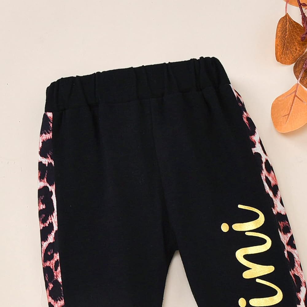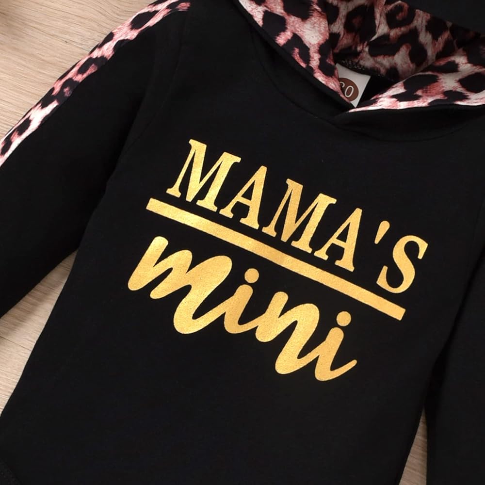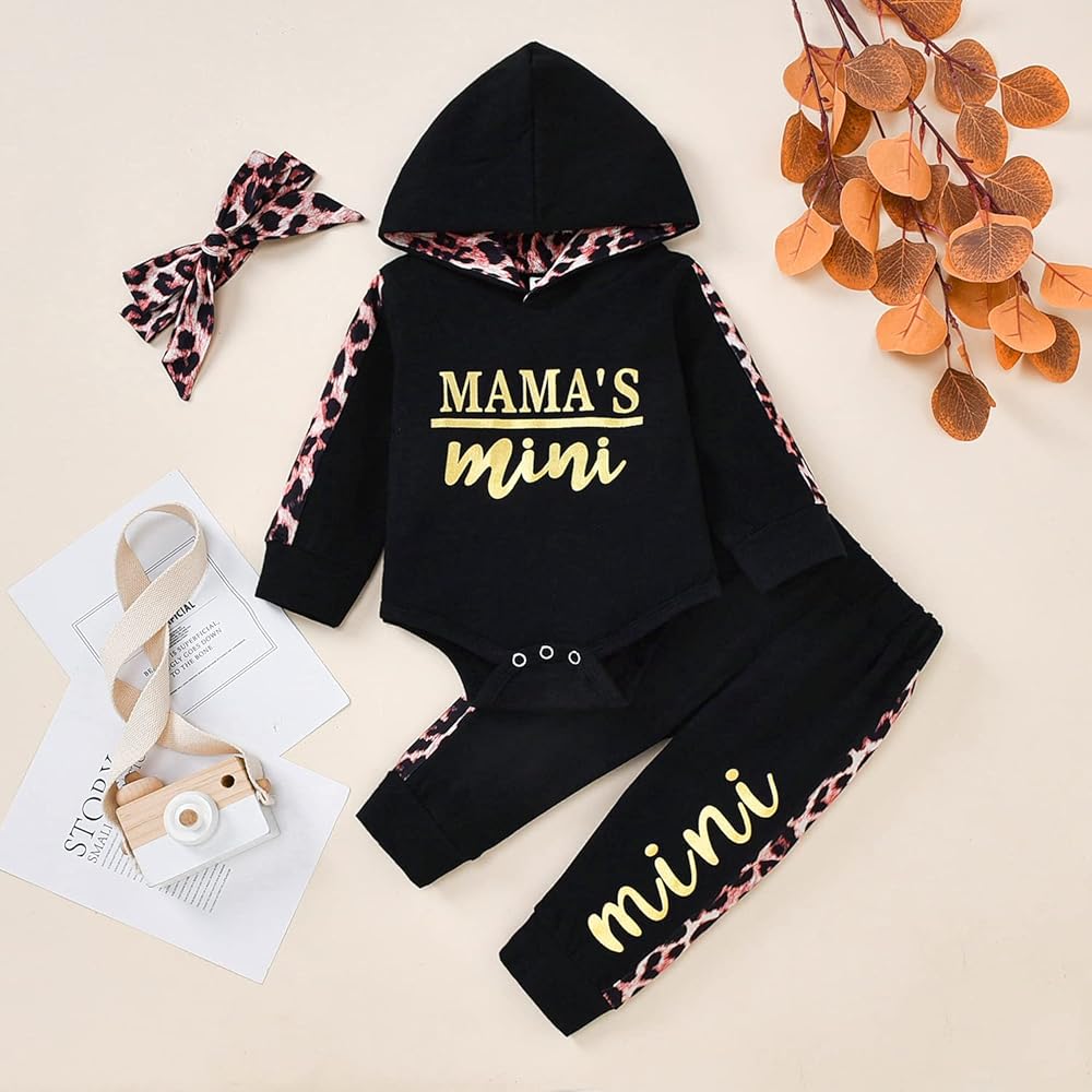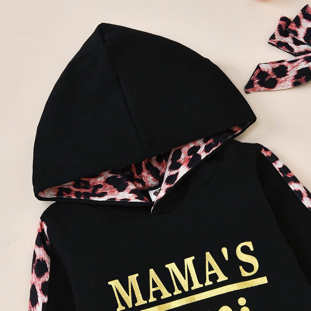 Design of infant girl hoodie romper sweatsuit: Sweet letter printing top is lovely. Leopard stitching hooded sweatshirt looks more adorable. Snap buttons design on baby girl onesie top with hood is convenient for changing diapers. Elastic waistband sweatpants, it's easy to put on and take off.