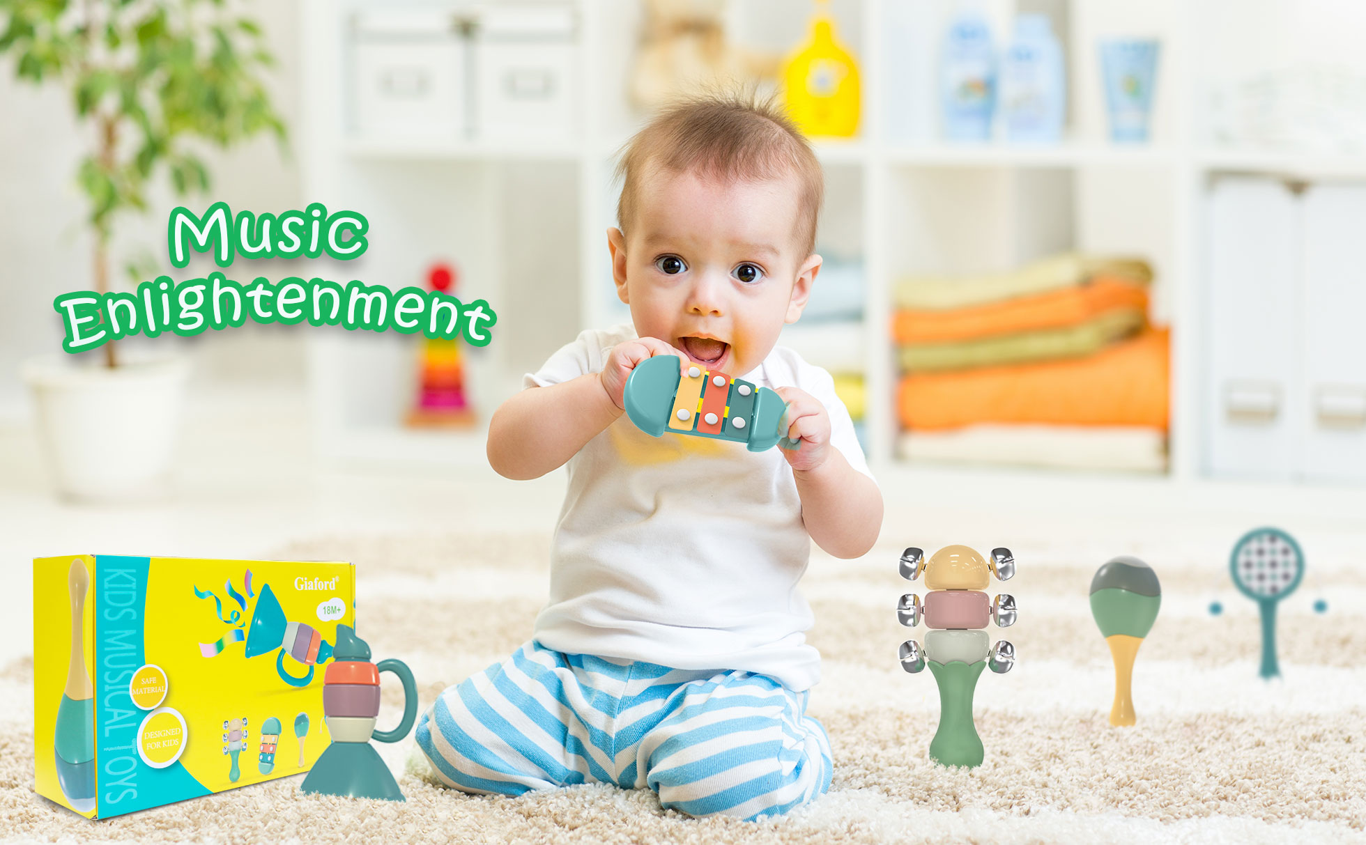 MUSIC ENLIGHTENMENT - Giaford Instrument Kit contains 5 toy musical instruments, rattle, maracas, trumpet, xylophone, stick bells and they can make different sounds to attract baby's attention, they are baby's favorite toys