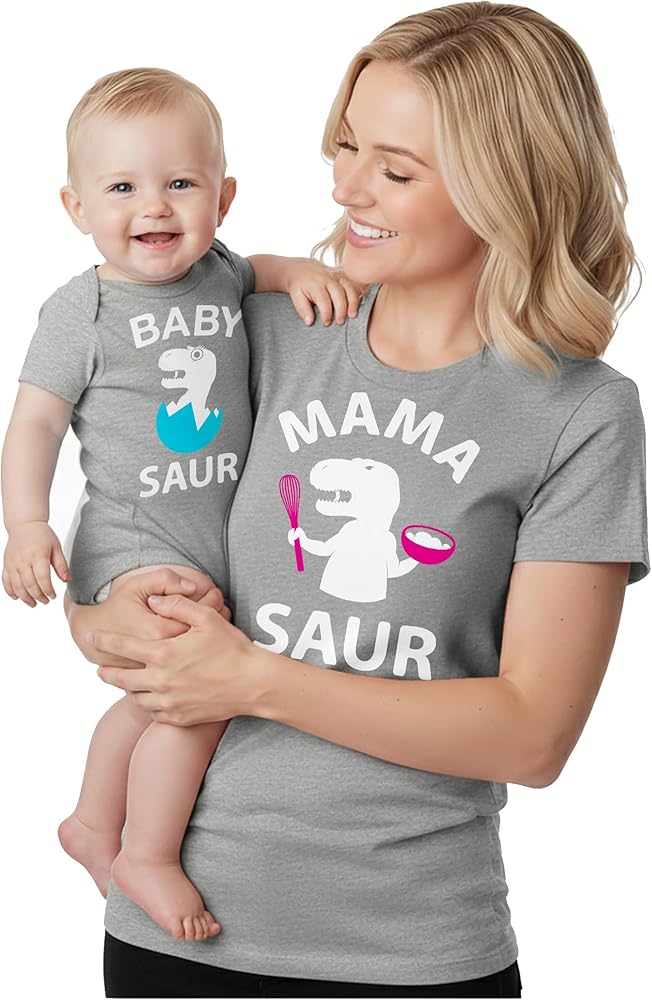 Mother's day mom and baby matching outfits set women's t-shirt + infant bodysuit; Mama saur and baby saur t-rex. Fun casual wear to show off mommy's little one