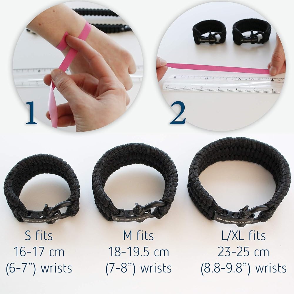 ✅ ADJUSTABLE SIZE: The bracelet has three sizes. Small is ideal for a wrist measuring 6“ to 7“. Medium size is ideal for a 7“ to 8“ wrist. XL size is ideal for 8.5“ to 9.8“ wrist. The adjustable D shackle allows you to fine-tune the size for a custom fit.