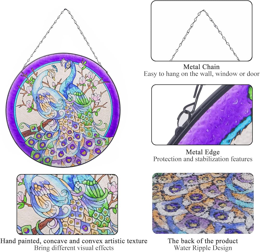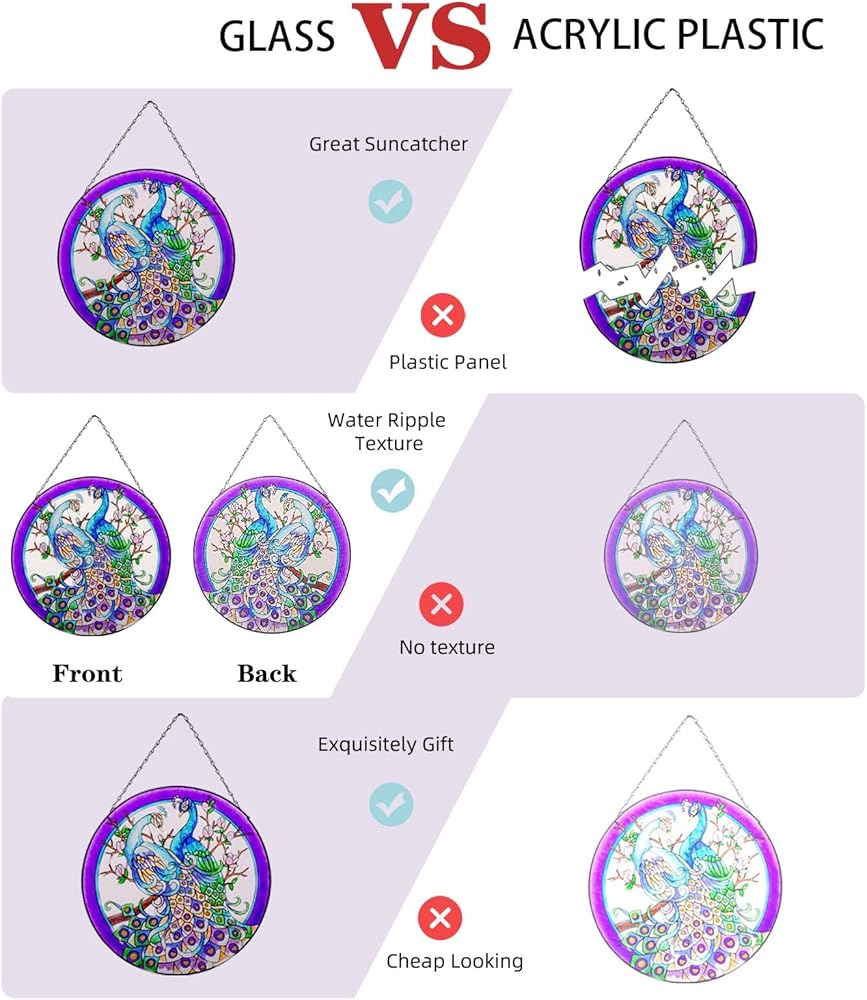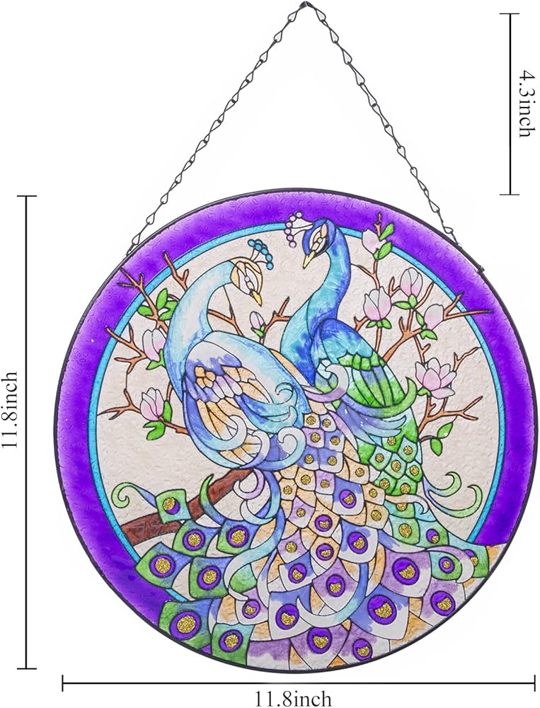Real Glass: Please note that our peacock suncatchers are made by glass rather than cheap acrylic plastic. Every stained glass windows panel hanging decor was hand colored by our skilled worker.