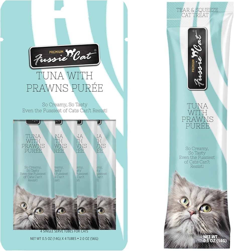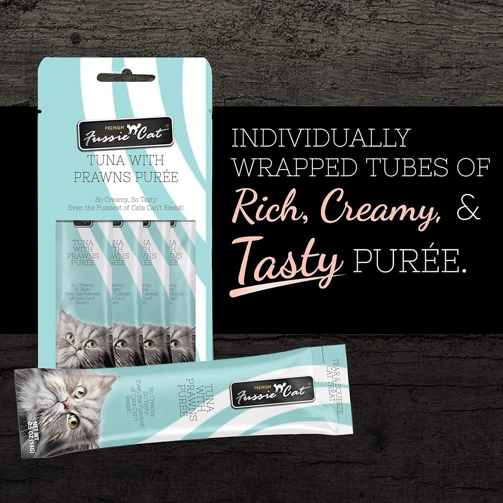 Indulge your feline friend with these delicious and creamy Fussie Cat Puree Cat Treats. They come in individually wrapped tubes of rich, velvety, and tasty puree in 8 delectable flavors*. Each recipe has zero grains, artificial preservatives, or colors, which makes it a purr-fect addition to your cat's healthy diet. Highly palatable, Fussie Cat Puree Cat Treats feature tuna or chicken to make it easy to share fun and joyful moments with your cat. Serve it as a topper for your cat's favorite meal or straight out of the tube as a delicious paw-some snack.