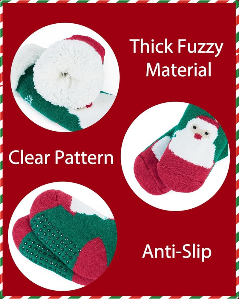 Material:Toddler christmas socks for girls boys are made of super soft warm microfiber stretchy fluffy which contain 90%acrylic and 10%spandex. Toddler fuzzy slipper socks provide maximum coziness for little feet keeping them warm, soft and sweat-free.