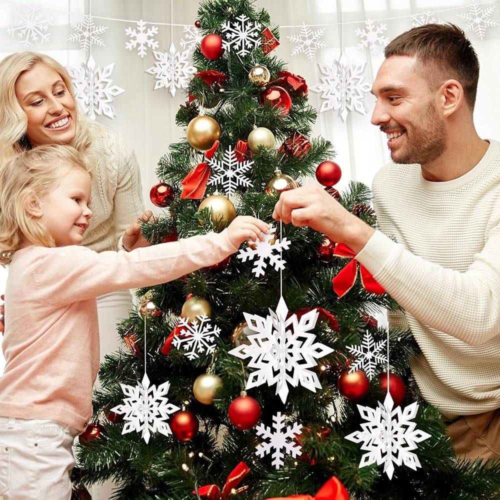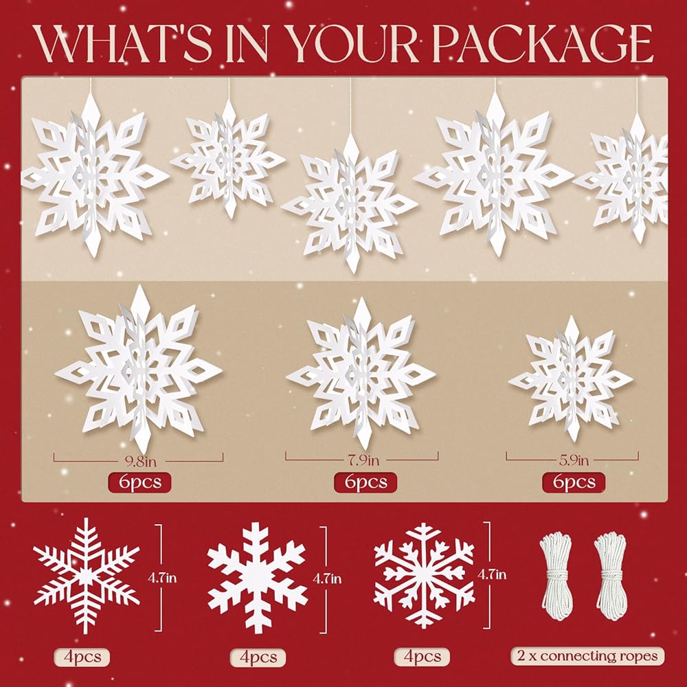 【Snowflake Ornaments for Christmas】 The snowflake ornaments set include 18 pieces 3D white paper snowflakes with 18pcs large snow flakes and 12pcs snow flake in a 9.8ft string. The fantastic 3D hanging snowflakes can hanging on the Christmas tree or the window decorations, Various sizes of snowflake winter wonderland party decorations give a nicer variety on the tree.