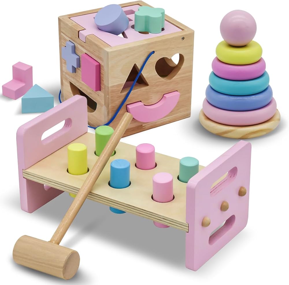 مجموعة رائعة للمبتدئين: تتضمن 3 ألعاب كلاسيكية. مقعد قصف الخشب، صندوق فرز الخشب، ومكدس خشبي بألوان قوس قزح