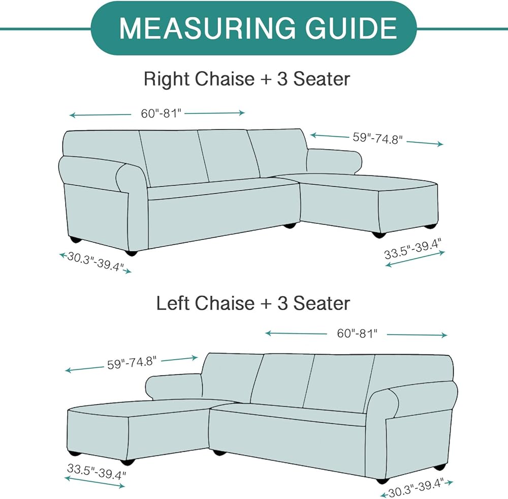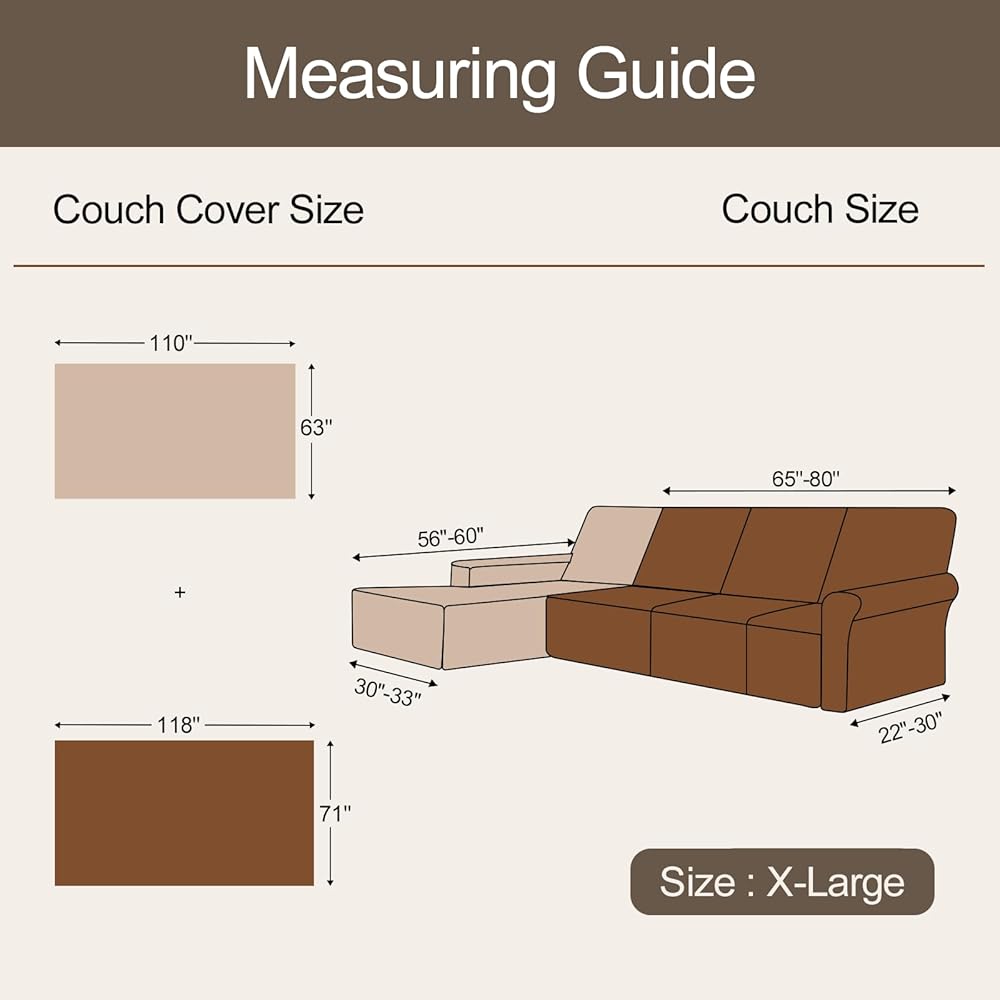 2 Sizes for your choices: Large size(110 * 63+102 * 71 inches) for Right/Left Chaise+2 Seats, X-Large size(110 * 63+118 * 71 inches) for Right/Left Chaise+3 Seats