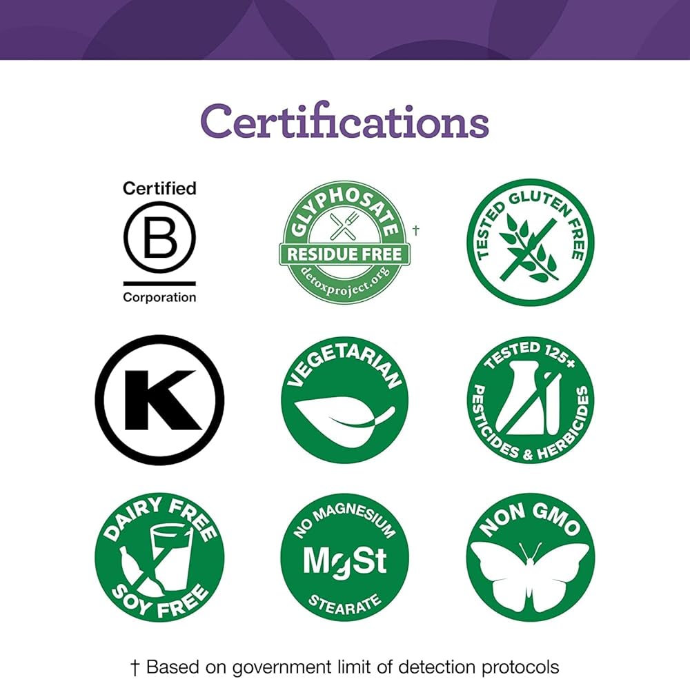 Put To The Test: Non-GMO; Certified B Corp; Certified Kosher; Tested for over 125 chemical substances; Free of gluten, dairy and soy