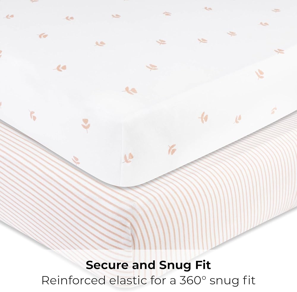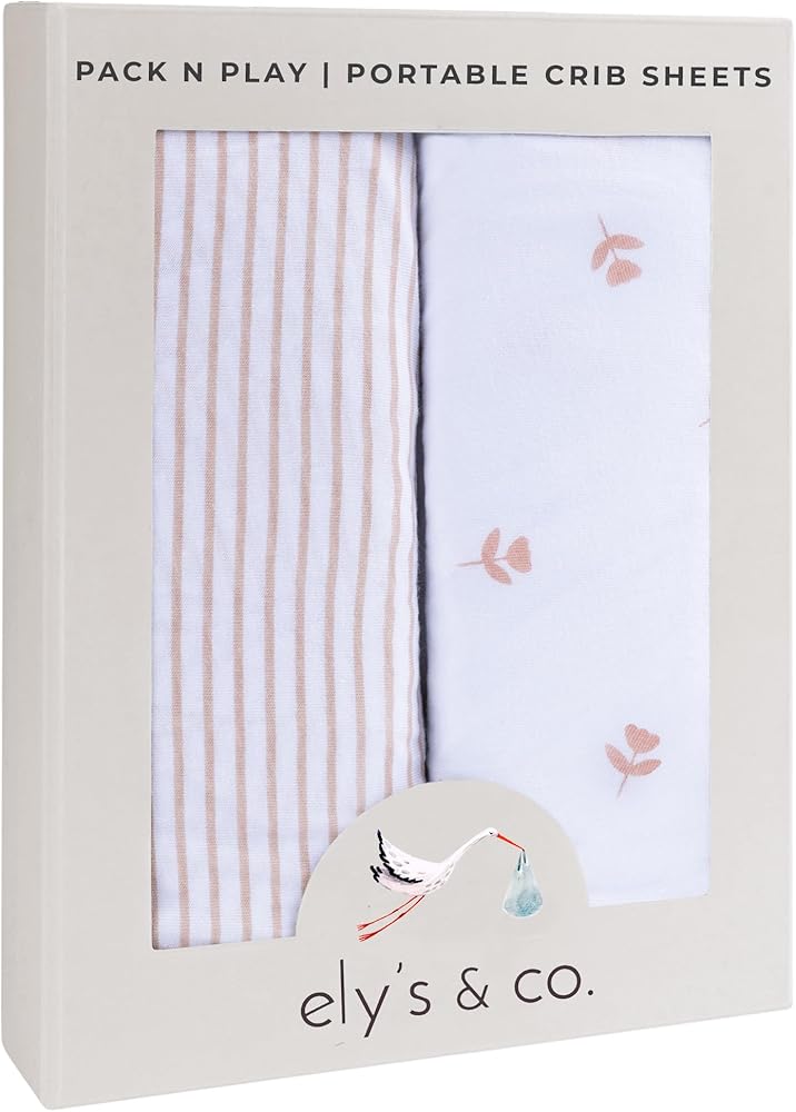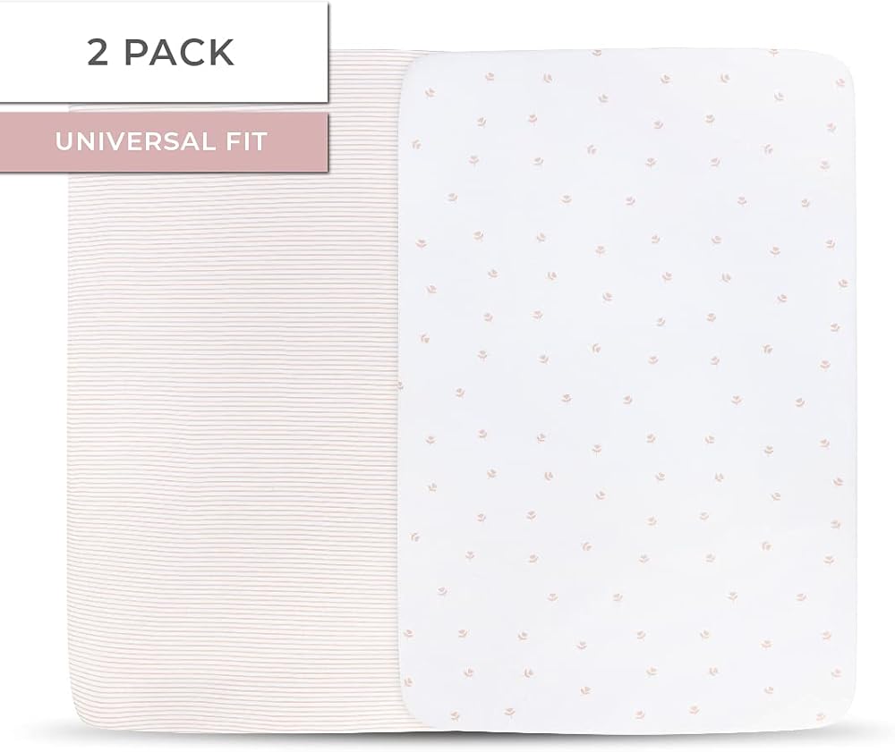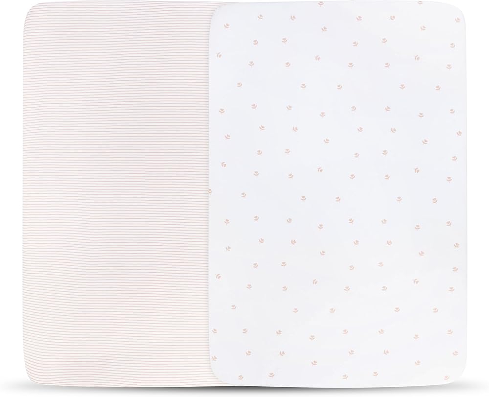 Ely’s & Co. Pack and Play Sheets, for Mini/Portable Crib, 2 Pack Fitted Playpen Play Yard Sheet Set Compatible with Graco Pack n Play, for Baby Girls, 100% Cotton, Pink Tulips and Stripes, 38"x24"x5"