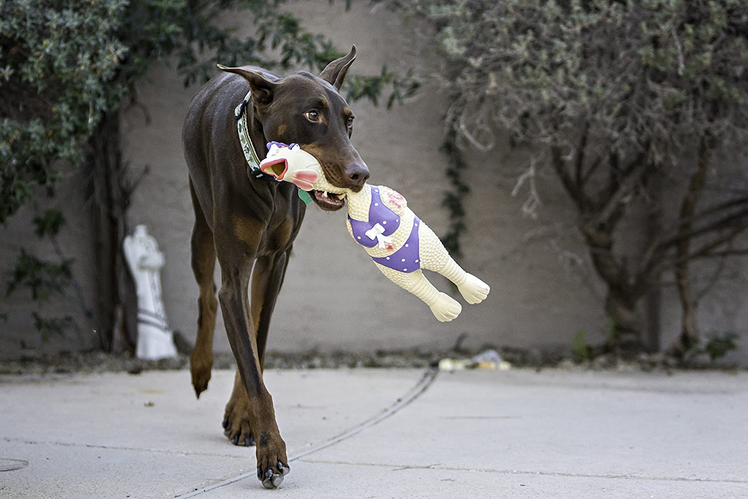 SILLY SQUAWKING DOG TOY: Squawkers latex rubber dog toys are a collection of funny chicken characters that come with an irresistible squawking squeaker your dog will love! Holiday edition Squawkers make a great gift for the furry friend in your life!