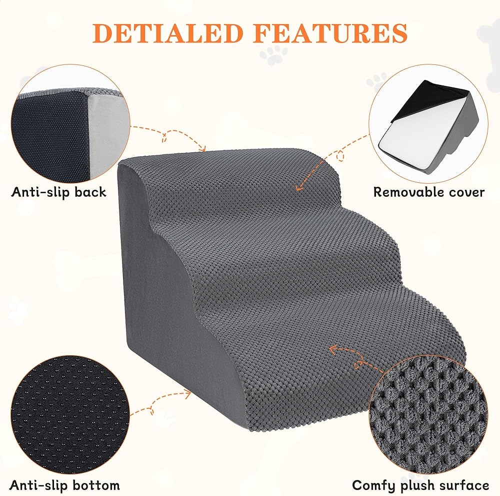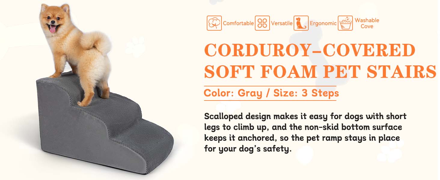 【MACHINE WASHABLE & ANTI-SLIP COVER】We understand that pets can be messy, so we've got you covered. The removable corduroy cover of the dog stair is both machine washable and hand washable. The bottom and back of the dog steps are equipped with anti-slip surfaces, keeping the doggy steps securely in place as your pet moves up and down.