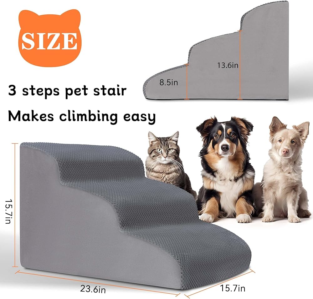 【HIGH DENSITY SPONGE】Inside these puppy stairs, you'll find a resilient high-density sponge that provides reliable support for dogs or cats weighing up to 55 pounds. Measuring 15.7 x 15.7 x 23.6 inches, the pet stairs for cats are tailored to fit furniture up to 17 inches high, such as sofa, windowsill and low bed, providing a comfortable solution for pets of various sizes.