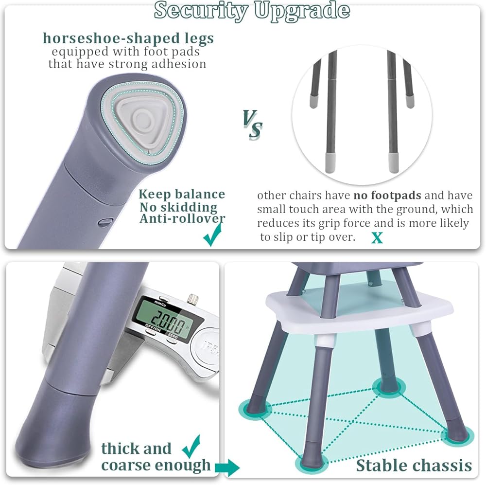 👉【 Sturdy and Stable Frame 】 The base of the high chair is wide enough to provide stability and prevent tipping over. The horseshoe-shaped non-slip feet keep the feeding chair firmly in place and prevent it from sliding on smooth surfaces.