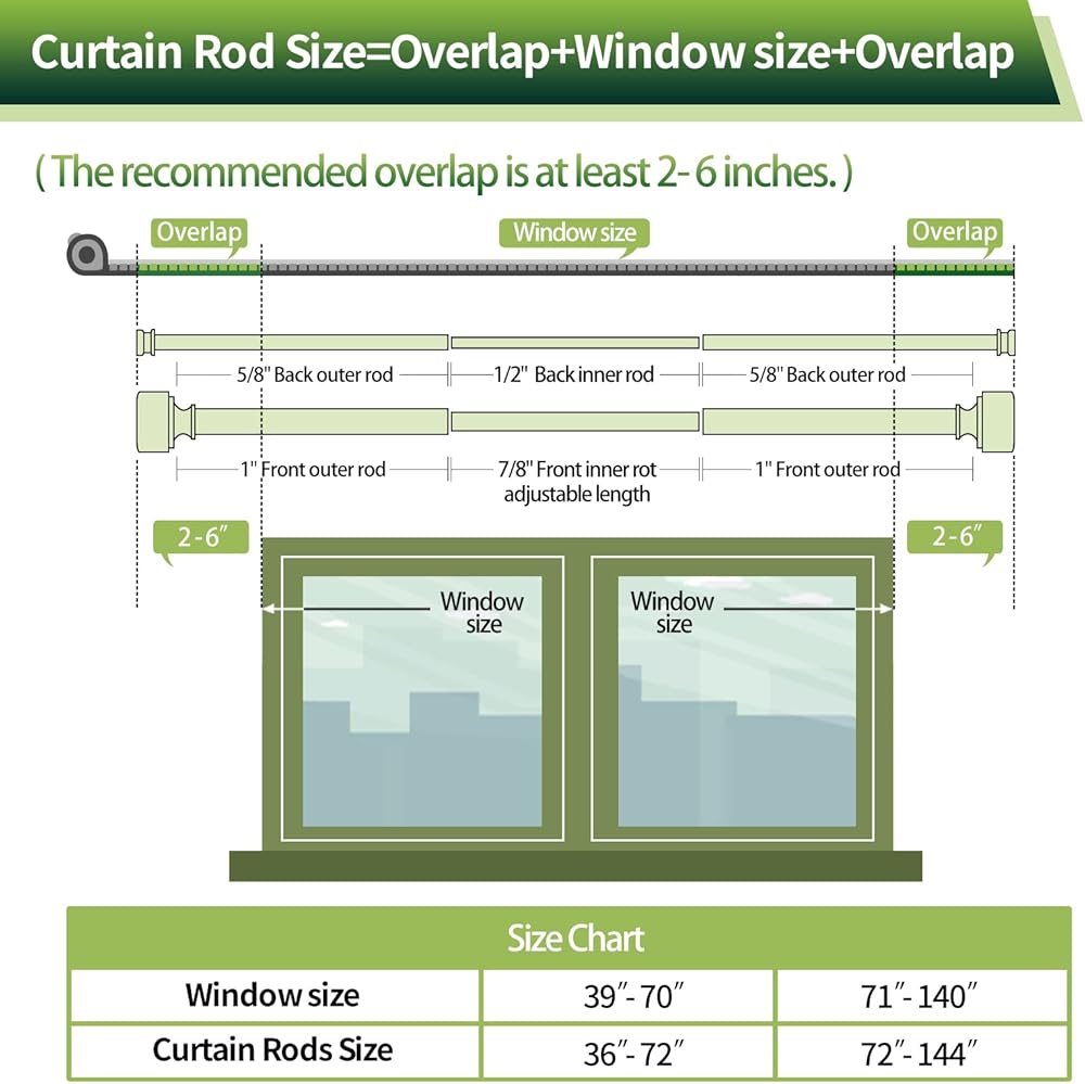 🌲قضبان ستارة مزدوجة قوية ومتينة: قضبان ستارة مزدوجة متداخلة من TANGWIN لها قضيب ستارة أمامي بقطر 1 بوصة وقضيب ستارة خلفي 5/8 بوصة، كل قضيب مصنوع من الحديد ودعامات الحديد ومسامير قوية، وتمت معالجة قضبان الستارة المزدوجة عالية الجودة مع عملية طلاء معالجة بدرجة حرارة عالية مثبتة، سطح أملس، جميل ومتين. يمكن لقضبان الستارة المزدوجة شديدة التحمل أن تتحمل ما يصل إلى 30 رطلاً دون أن تغرق، وتدعم الضوء للستائر الثقيلة، ويمكن أن تؤدي إلى تأثير تعتيم مزدوج.