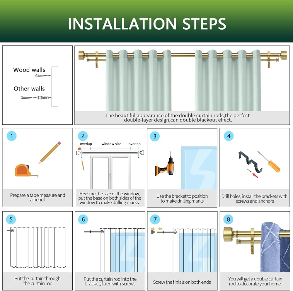 🌲قضبان ستائر مزدوجة سهلة التركيب: توفر TANGWIN تعليمات مفصلة بالحجم وحزمة شحن قضبان ستائر مزدوجة مزخرفة حديثة تحتوي على تعليمات تركيب مفصلة بالداخل، اتبع الخطوات، يمكن لقضبان الستارة المزدوجة الذهبية إكمال التثبيت بسهولة.