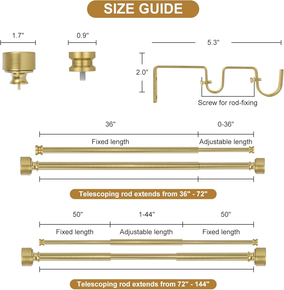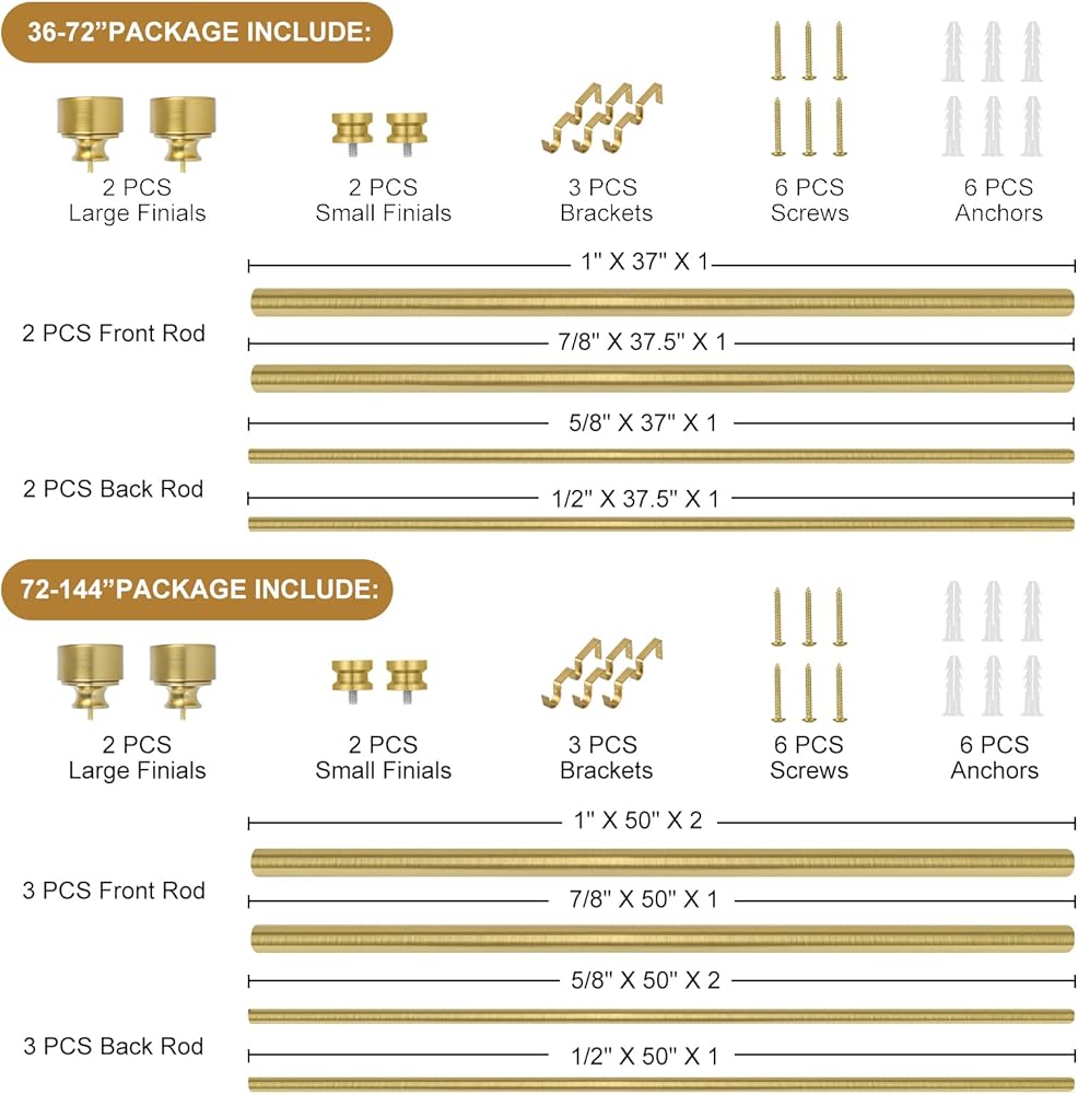🌲قضبان ستائر مزدوجة للنوافذ من 72 إلى 144 بوصة (6-12 قدمًا): تتضمن قضبان الستارة المزدوجة شديدة التحمل من TANGWIN مجموعة واحدة من القضبان الأمامية (1 × 50 بوصة × 1 بوصة، قضيب ثابت، 1 × 50 بوصة × 7/8 بوصة، قضيب قابل للتعديل)، مجموعة واحدة من قضيب خلفي (1 × 50 بوصة × 5/8 بوصة قضيب ثابت، 1 × 50 بوصة × 1/2 بوصة قضيب قابل للتعديل)، 2 × لمسة نهائية كبيرة، 2 × لمسة نهائية صغيرة، 3 × دعامة، 6 × مرساة، 6 × برغي. ذهبي يمكن أن تمتد قضبان الستارة المزدوجة القابلة للتعديل من 72 إلى 144 بوصة، اختر قضبان الستارة ذات الحجم المناسب وفقًا لطول نافذتك.
