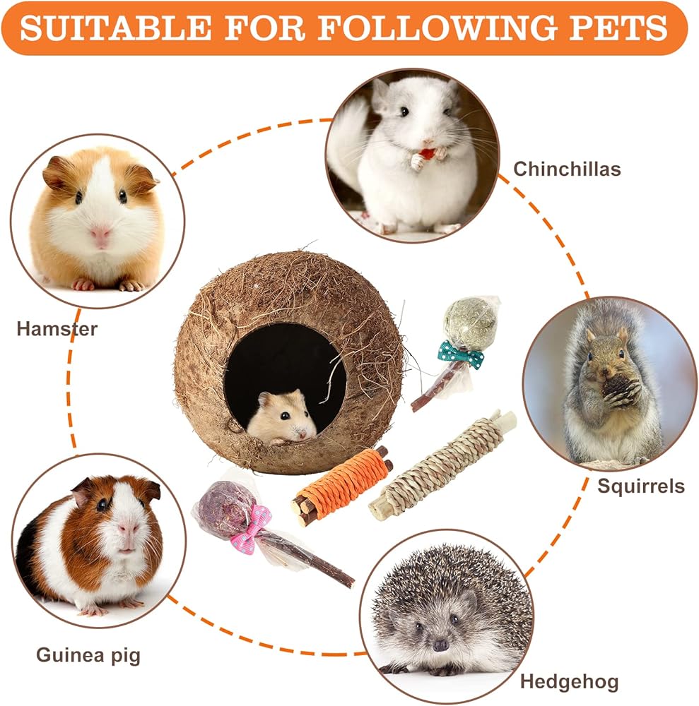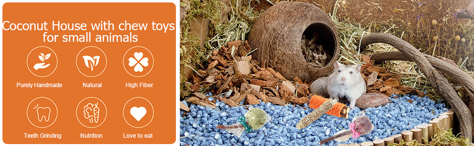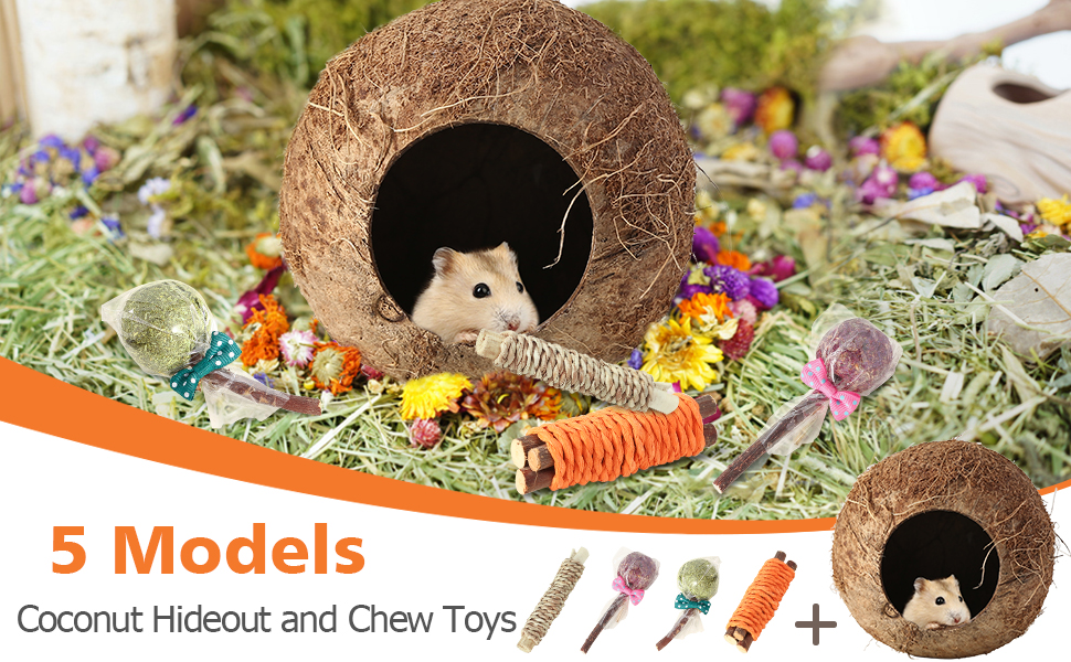 HAMSTER TOYS PACKAGE CONTAIN:4 Pack small animal chew toys coconut hamster house and hideout