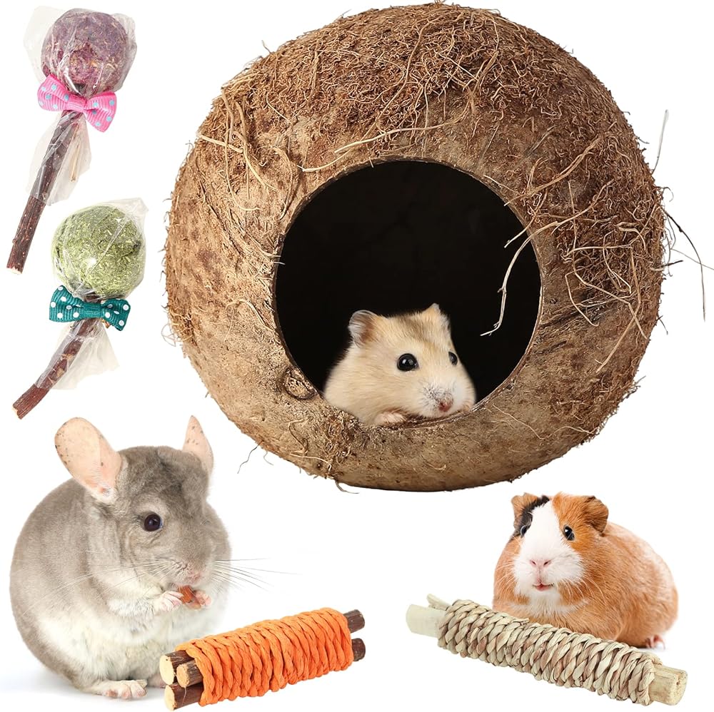 COCONUT SHELL HIDEOUT:This hamster house is made with natural coconut shell materials, ensuring its durability. It is a cozy hamster bed and can also be used as hamster accessories
