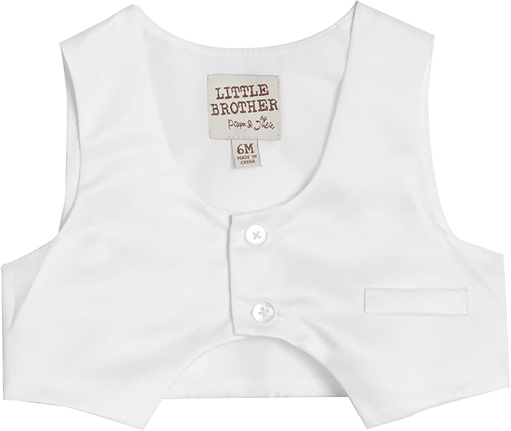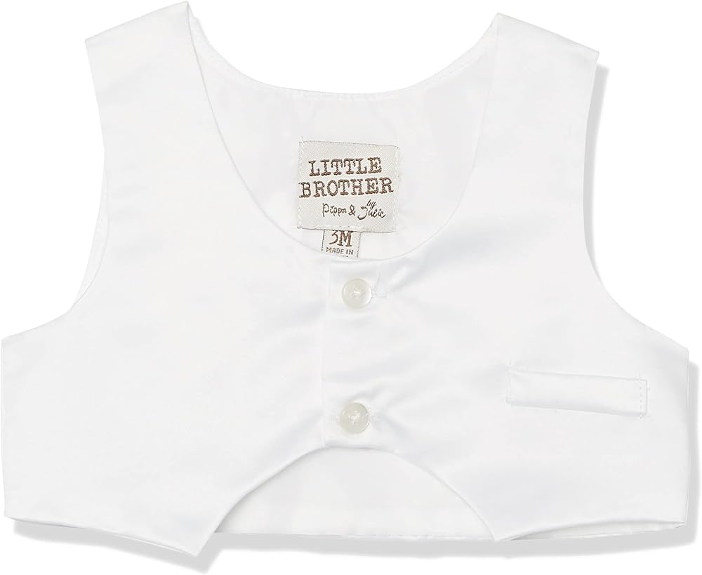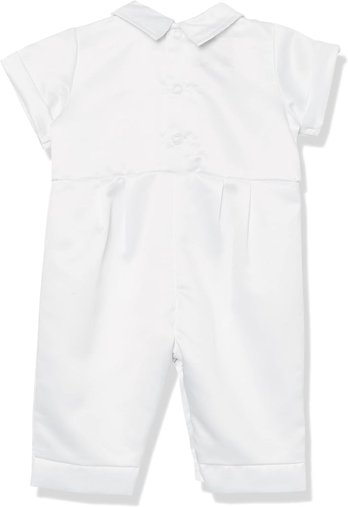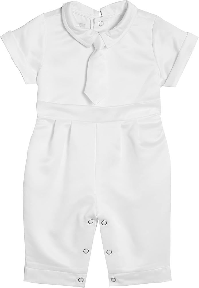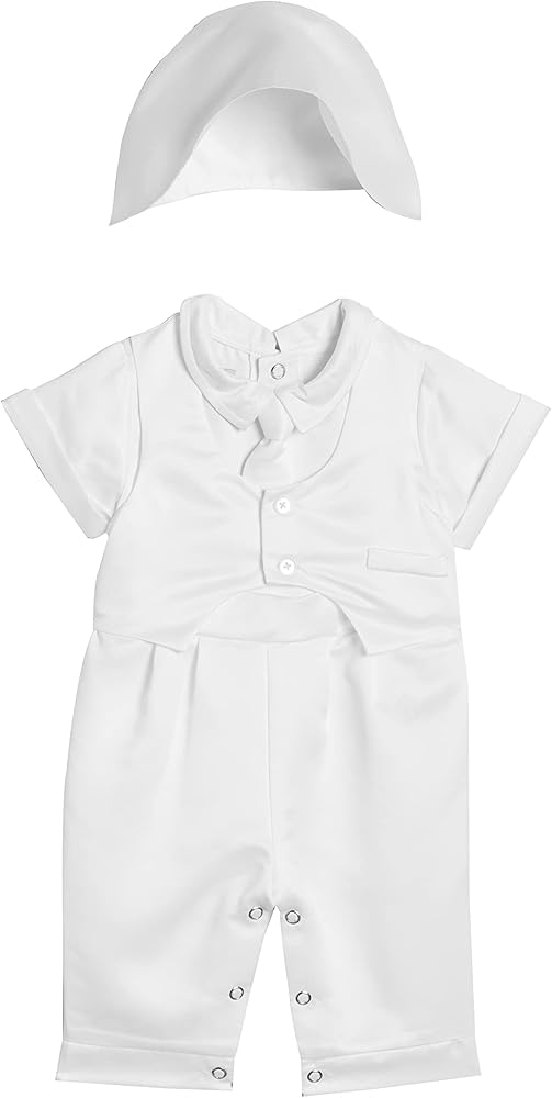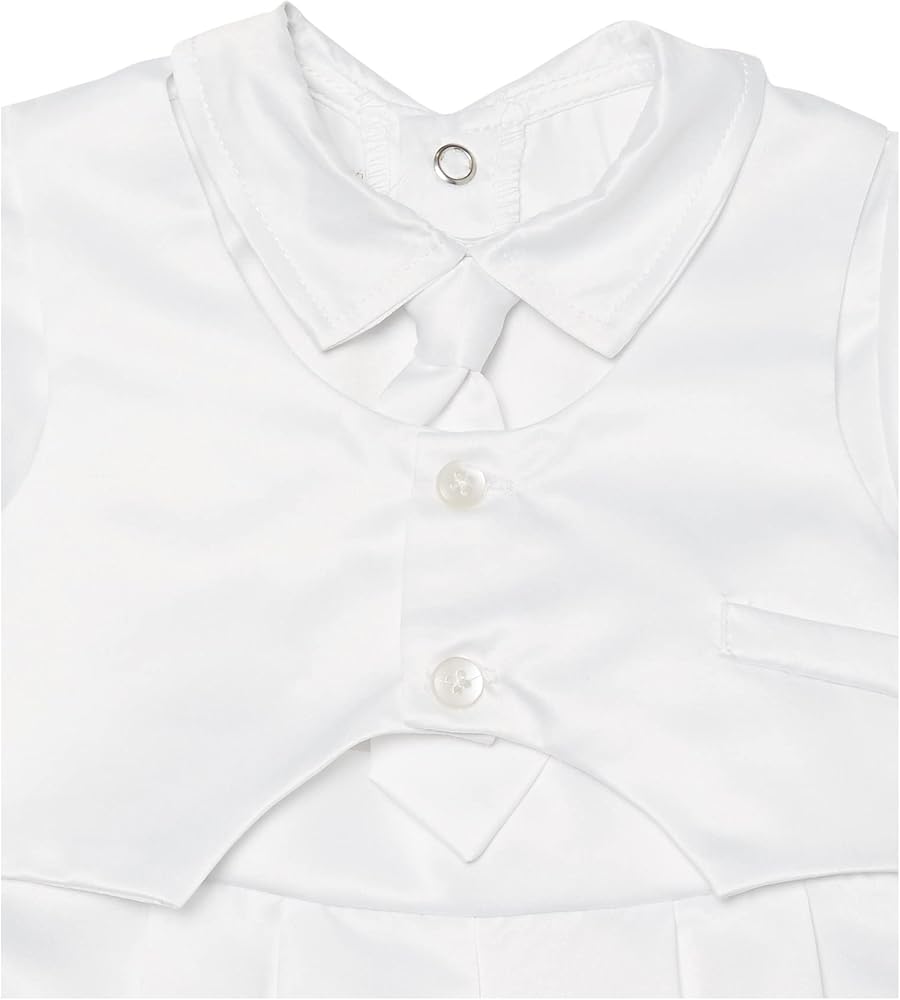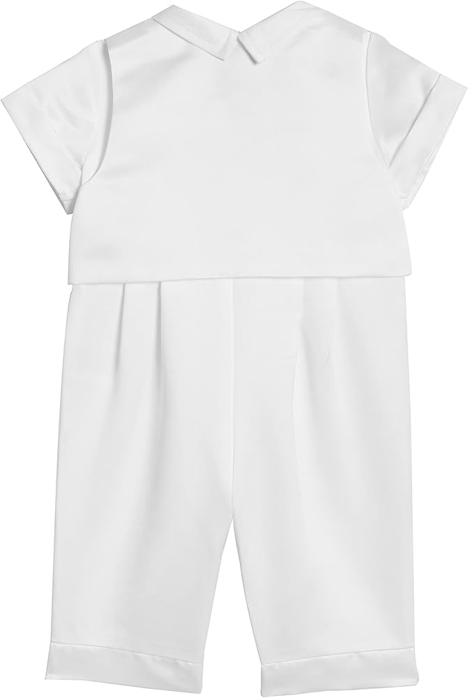 Baby boy Christening Set is a romper-style outfit with a collared neckline, faux tie, cuffed short sleeves and removable vest. The pants have gentle pleats and buttons along the leg for easy dressing. Includes a coordinating tie-bonnet.