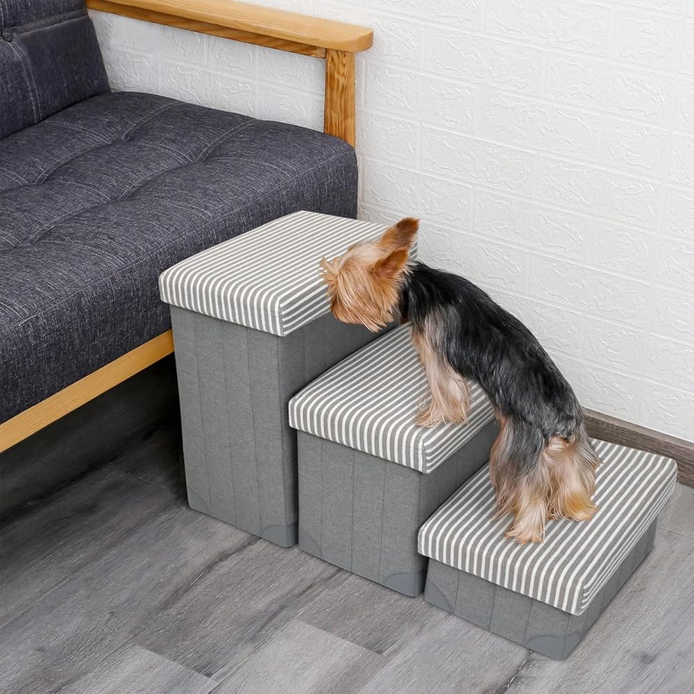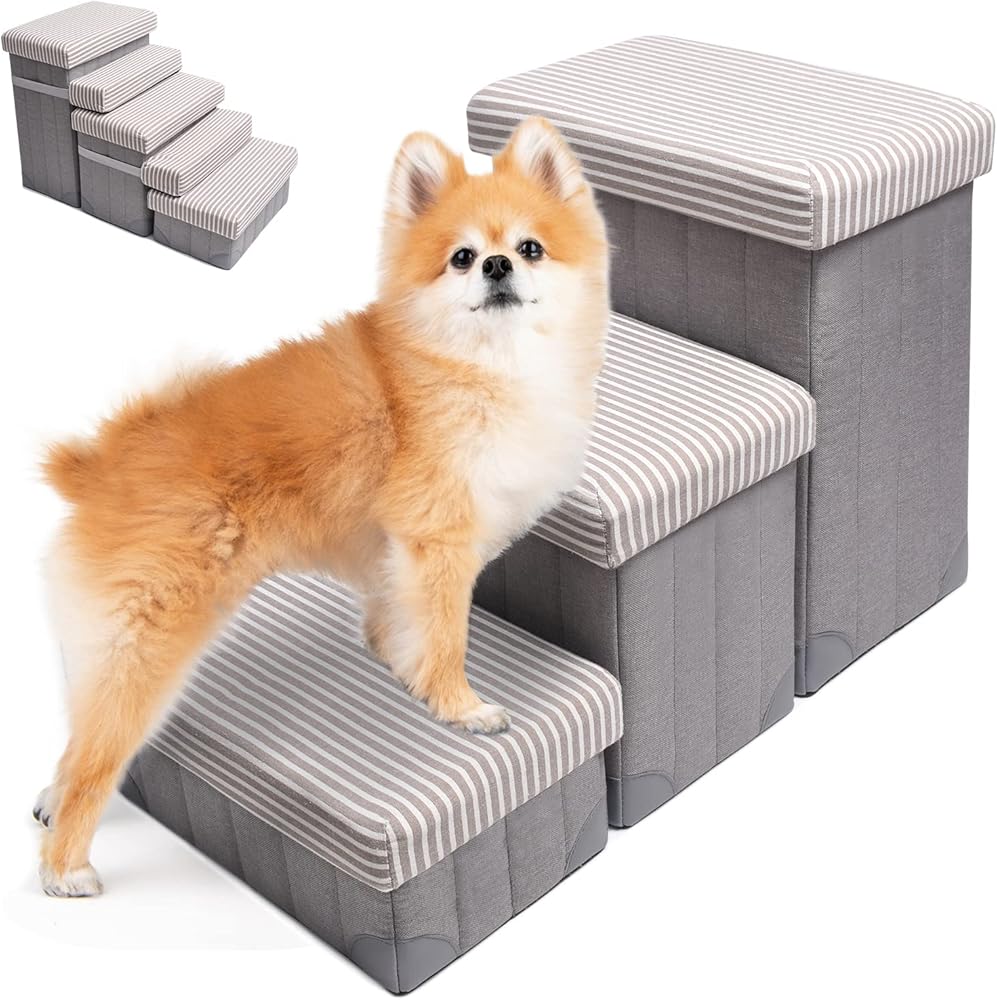 [Extra Storage Space & Folding Design]: There are storage spaces for each step, you can store treats, leashes, toys, and other pet supplies. Complete assembly or disassembly in minutes, perfect for travel. Recommend filling the storage up to maximize stability as a product intended.