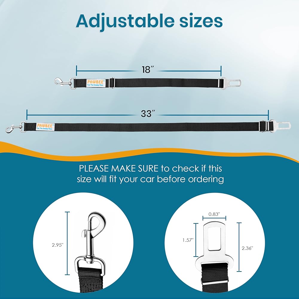 ★ VERY EASY TO USE - The PAWBEE dog car leash is very easy to put on your dog and can be done in no time. Just fix the clip to the pet harness loop, fix the dog car seatbelt into the seat belt holder and adjust the belt to the dog's height satisfaction. Note: The tab on the seatbelt clip is 2cm long. Be sure to check that your buckle is the right size and is compatible before you purchase.