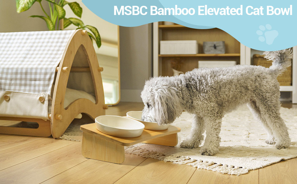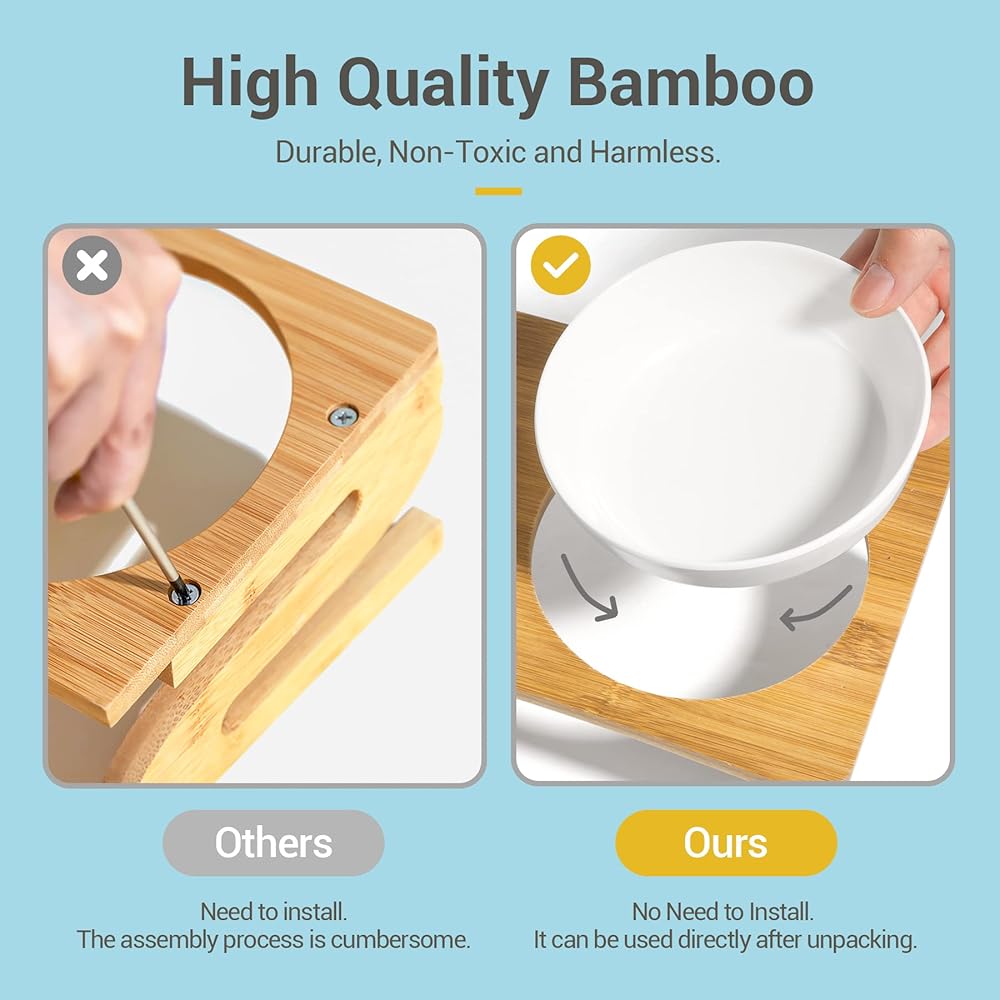 [High-Quality Material] The holding shelf is made of premium natural bamboo coated with varnish for water resistance and durability. And the bowls are made of harmless melamine, completely safe for your pets to use.