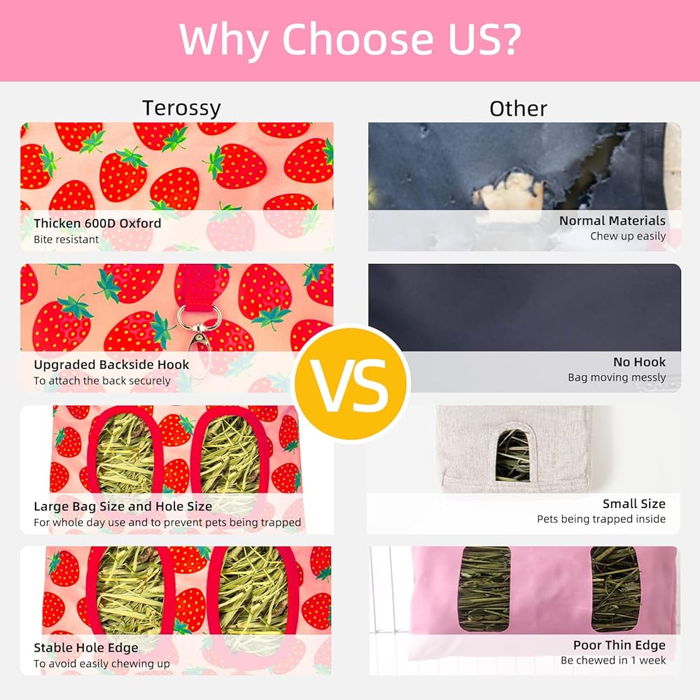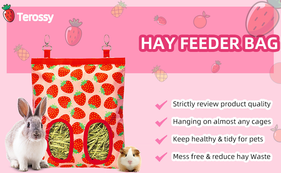 Quality Guarantee for Durable Use: Our Terossy hay bags are designed with durable 600D Oxford cloth material, washable odorless and bite resistant (not for aggressive chewers), very healthy for your pets. The thicker 4 layers of fabric reinforced holes avoid being chewed up easily, for steadily long-lasting use and saving your money. While if you are not satisfied with the product, you will enjoy Amazon 30-day Refund and Return Service from the date of your purchase.