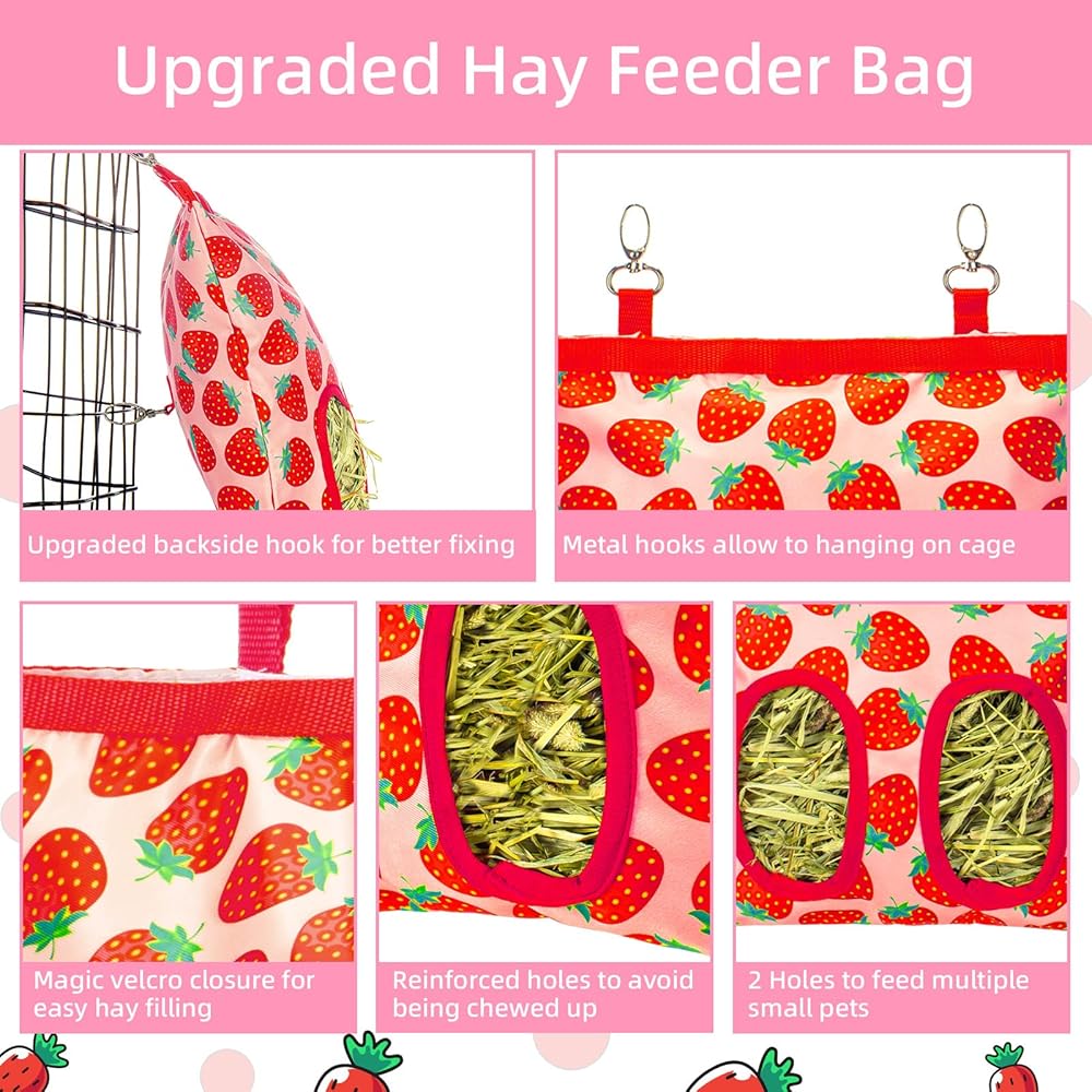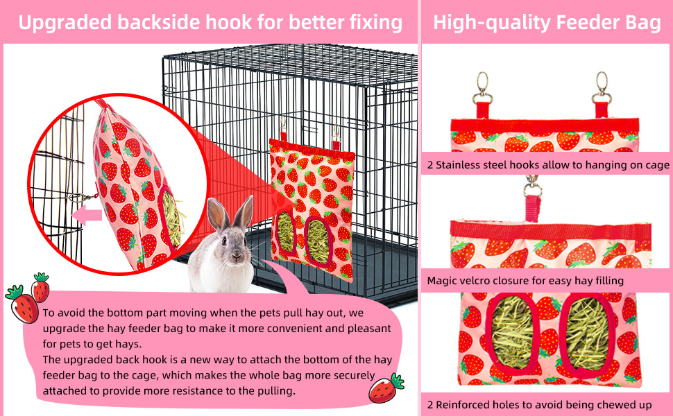Upgraded Practical Design: 1)Upgraded backside hook is a new way to securely attach the bag bottom to the cage, to avoid the bottom part moving when the pets pull hay out, bringing more convenient and pleasant for pets to get hays. 2)2 stainless steel hooks on top for hanging on almost any cages. 3)Large opening with magic velcro closure for easy hay filling and avoid pets entering from the top; 4)2 Reinforced holes avoid being chewed up easily, and suitable to feed one to multiple small pets.