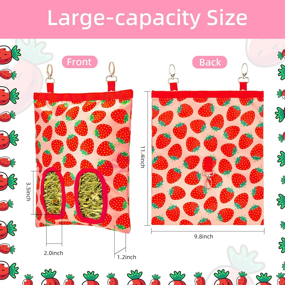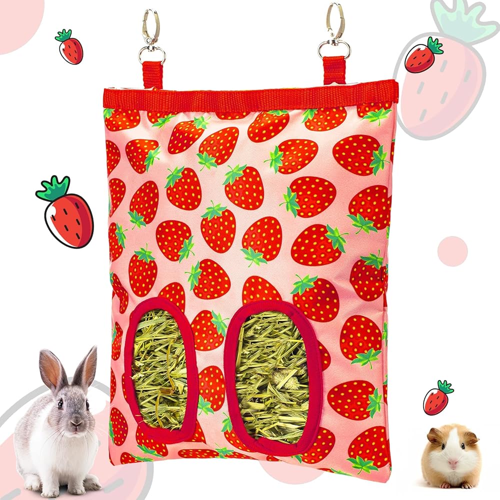 Cute Design & Easy to Use: Turn on the velcro, add hay, make the velcro close tightly, and fix hooks (Please be sure the bag size is suitable to the cage), it's Super Easy to Use; Unique cute patterns bring more personality, which is a great automatic hay feeder gift for rabbits, guinea pigs, hamsters, chinchillas, bunnies, hedgehogs, pet pigs and other small animals.