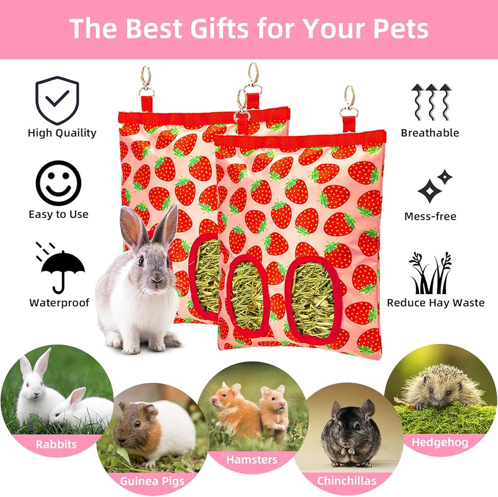 Keep Healthy & Tidy, Mess Free & No Waste: The breathable rabbit hay feeder bags maintain an abundant supply of hays inside which perfectly keep the hay dry and fresh; the hanging design saves cage space and keeps mess-free & debris-free in the cage, and also makes hays separated from the litter box, effectively moderating hay waste; It provides a comfortable and clean environment, thus your pets would feel healthier and happier with the hay feeder.