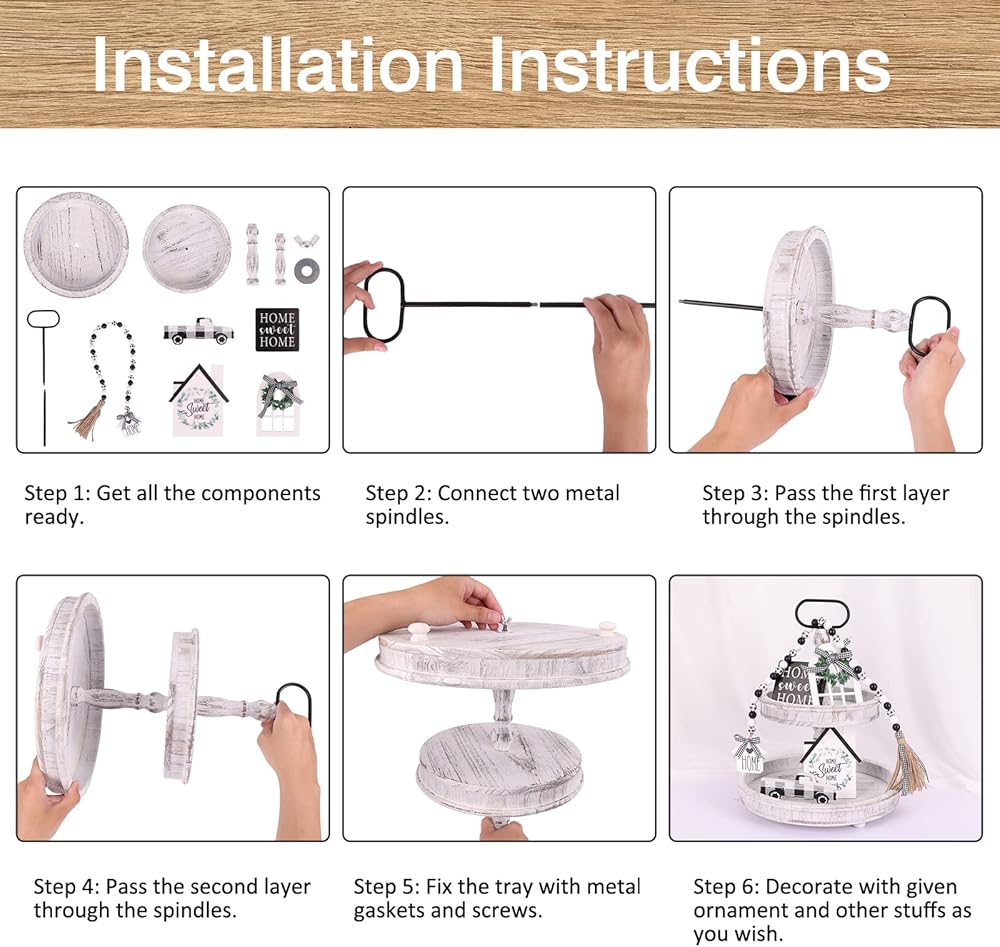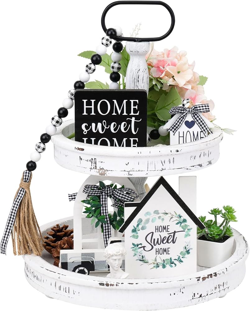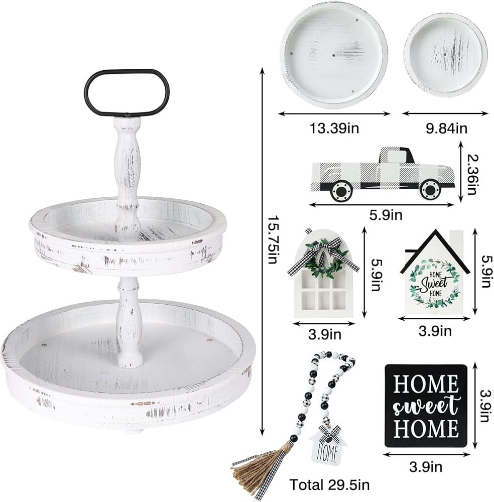 Package Includes: This package contains a farmhouse two-tiered tray and 5pcs of wooden signs and beads (sweet home sign*1, Cathedral arch window*1, wooden truck*1, house-shaped sign*1, wooden bead garland with tassel*1).