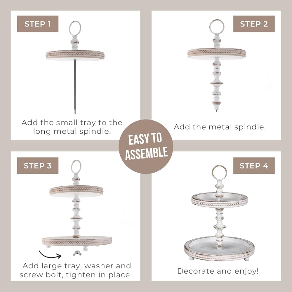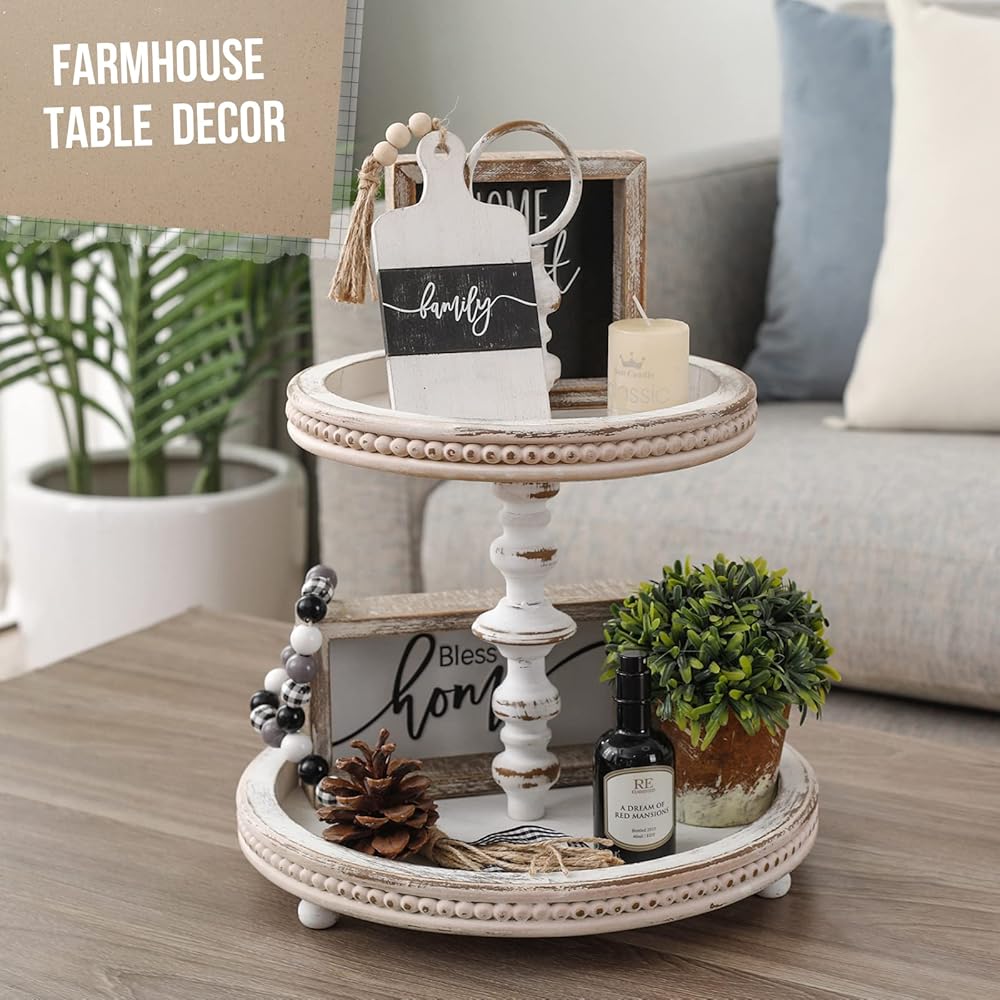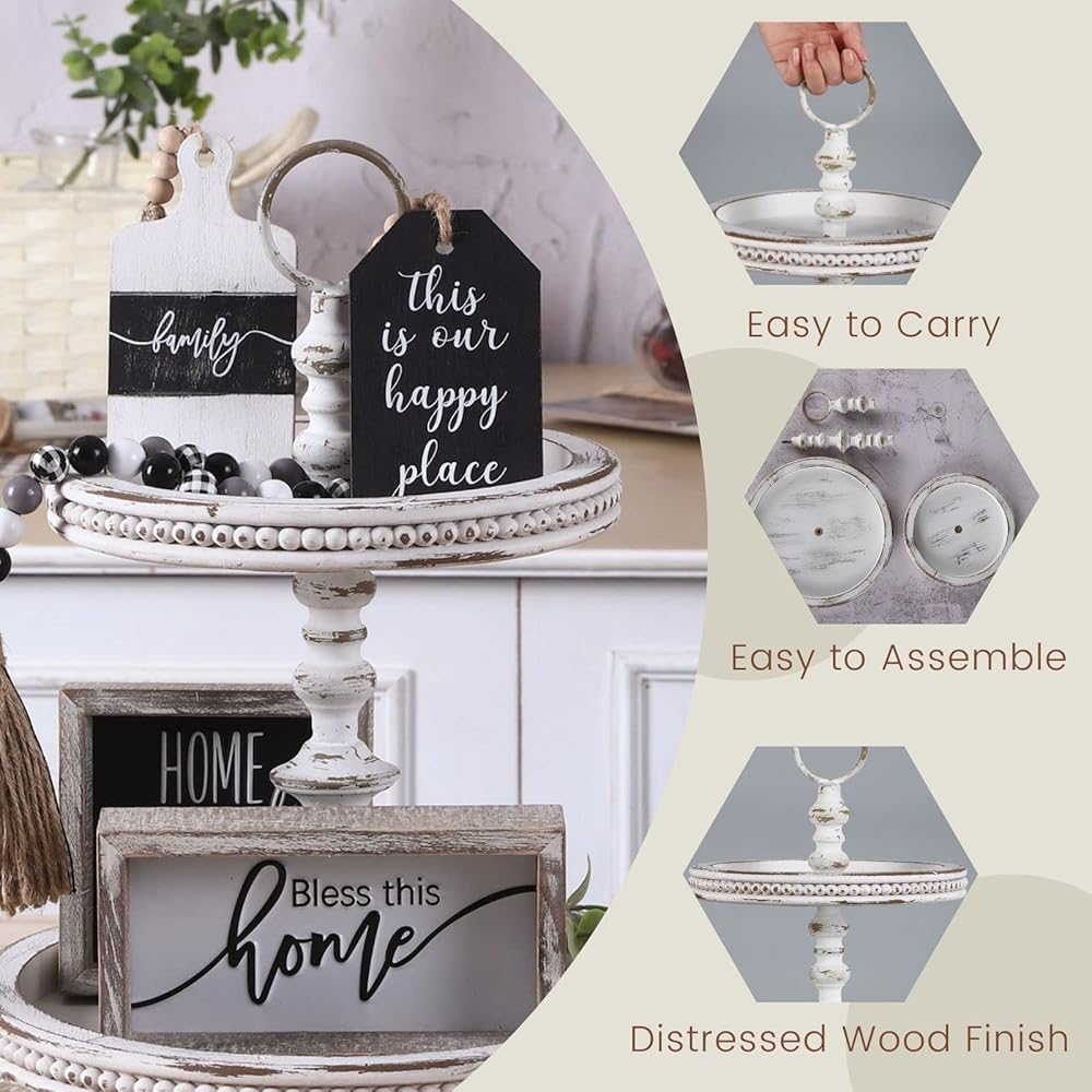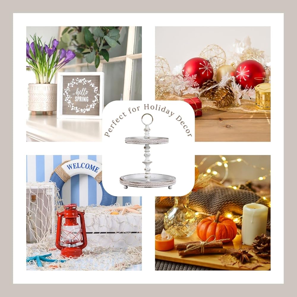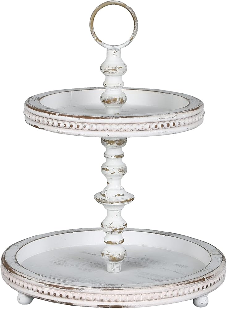 2 Tier Tray - Decorative Beaded Farmhouse Tiered Tray - Kitchen Island Decor Centerpiece - Small Tiered Tray Stand for Holidays - Lovely Housewarming Gift Rustic White