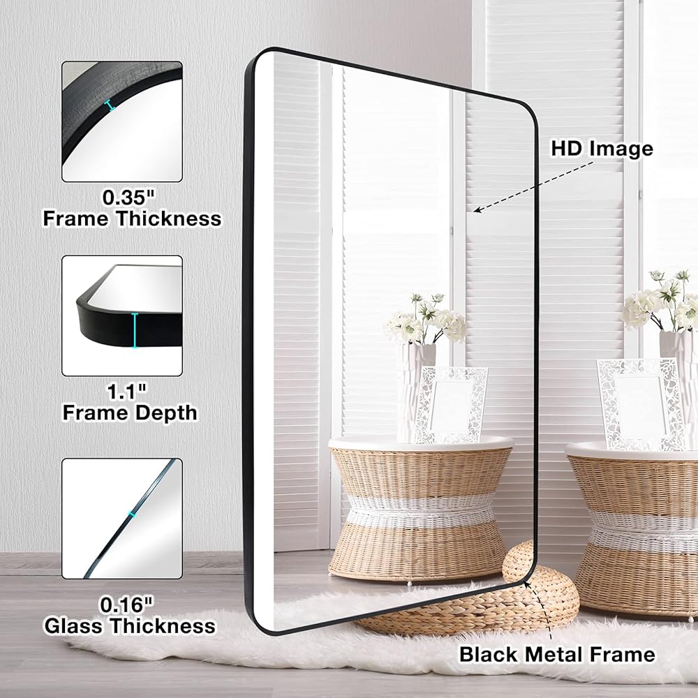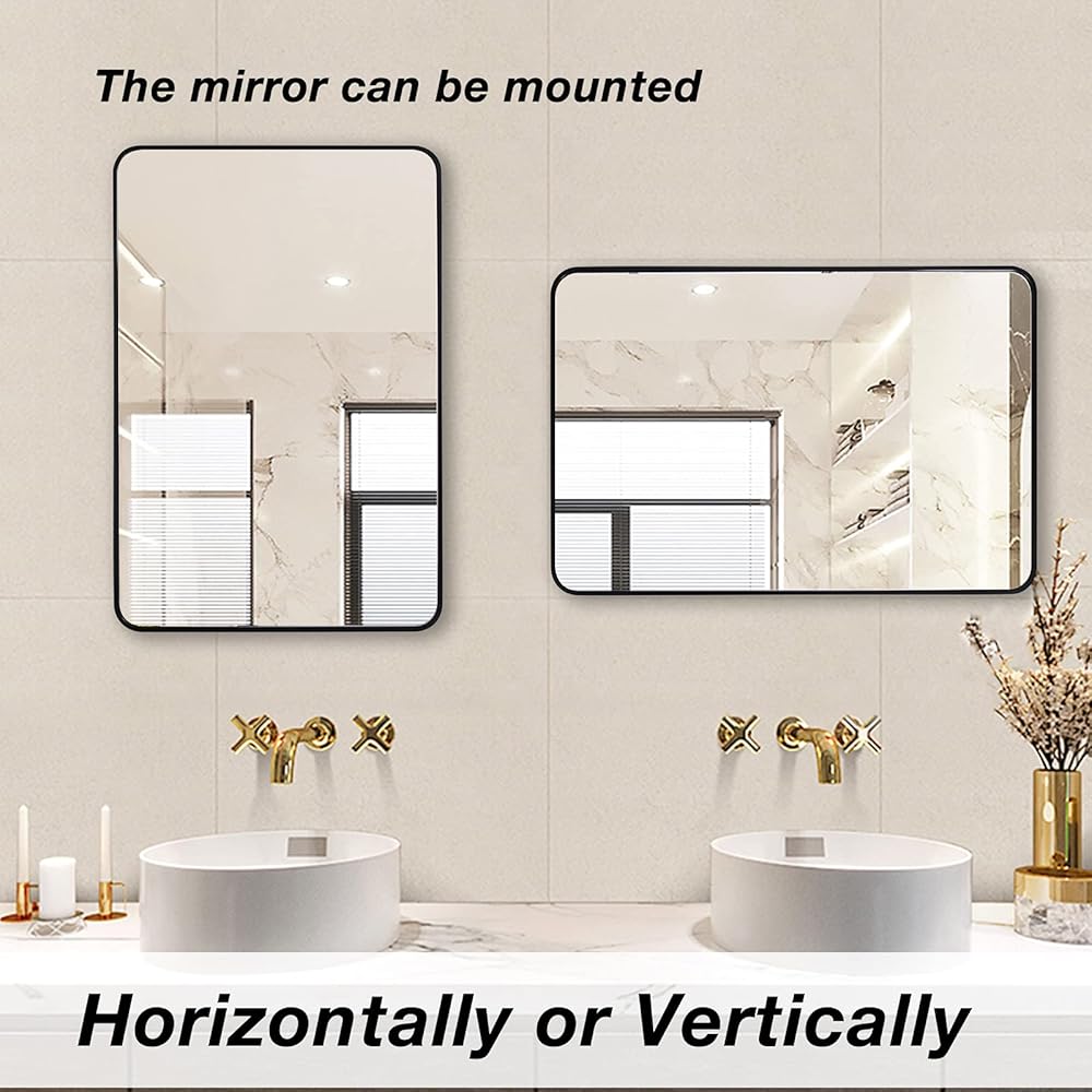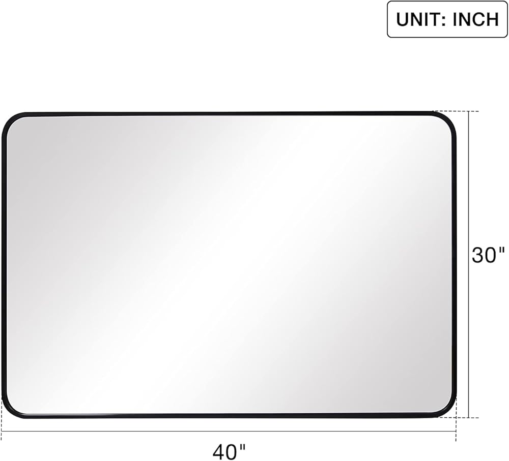 Dimension: 30" x 40" wall mounted mirror, black metal aluminum frame, the round corners make this mirror more aesthetic and safe.