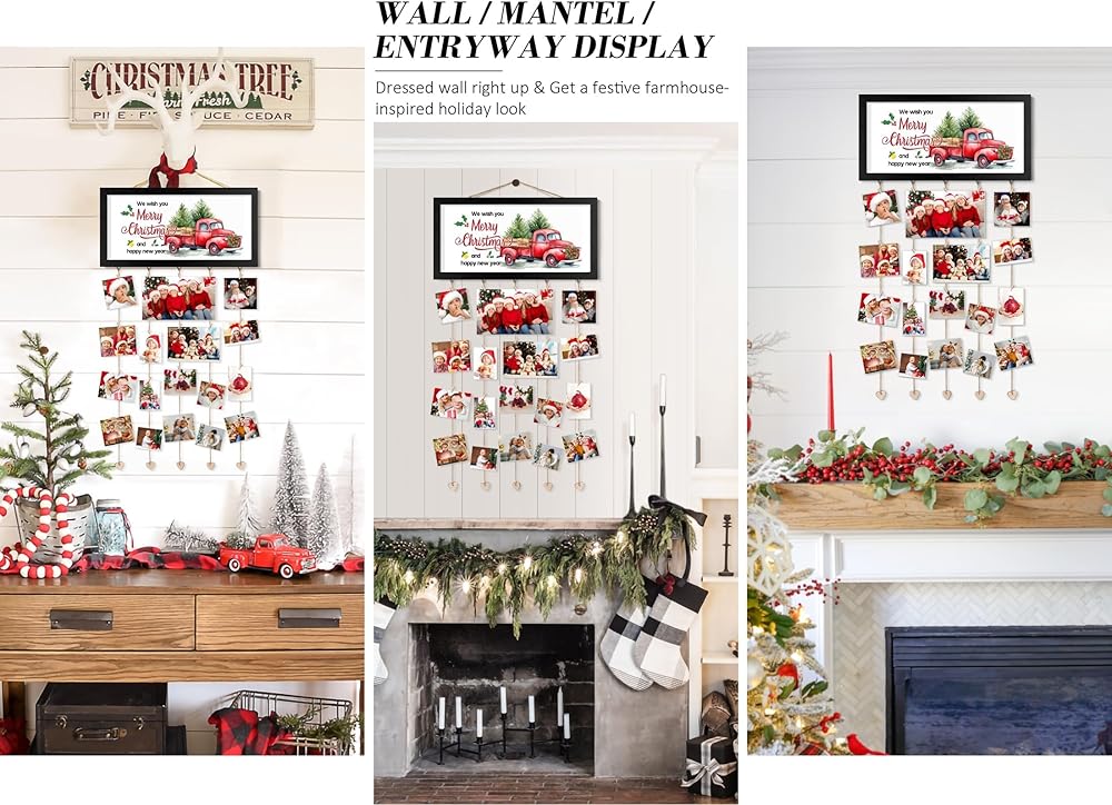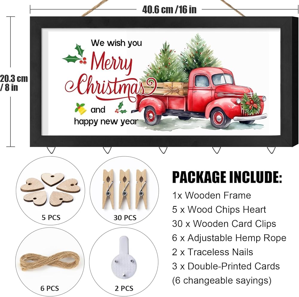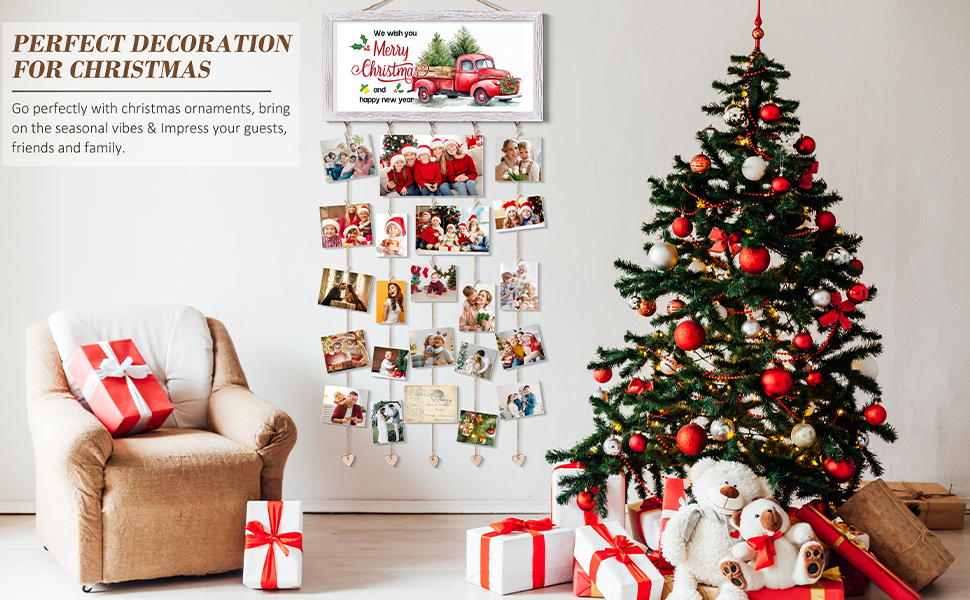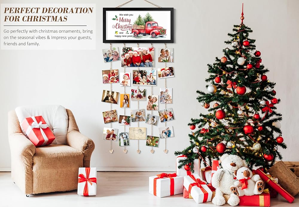 📸TOUCHING CHRISTMAS GIFT: Passionately designed with a elegant truck warm word “We Wish You Merry Christmas & Happy New Year”, the Christmas card display holder Xmas card holder Family Wall Decor is not only be a great room wall decor, reserve your memorable moment, also turns into a one-of-a-kind housewarming gifts, holiday gift, Christmas gifts for families, friends or new homeowner! The Christmas card holder wall display Hanging Christmas photo holder will surely delight them!