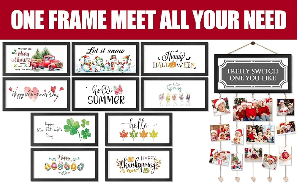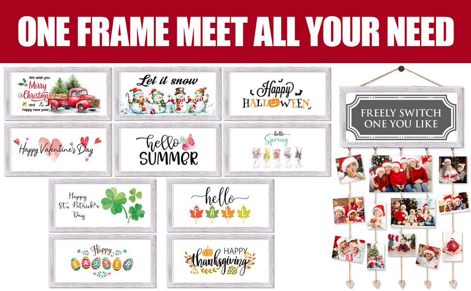 🌲DURABLE & RELIABLE CHRISTMAS CARD HOLDER WALL HANGING DECOR: Unlike other Christmas picture frame collage with flimsy wood, the Christmas Card Display Wall Hanger with 10 interchangeable sayings is made of sturdy Pine Wood in rustic white style for amazing durability & long-lasting use, high-definition Plexiglass cover to make sure gorgeous Christmas Kitchen Decor Mantel Decor. To switch saying, just rotate swivel tab & open backboard. You can store cards in to avoid getting bent, broken.