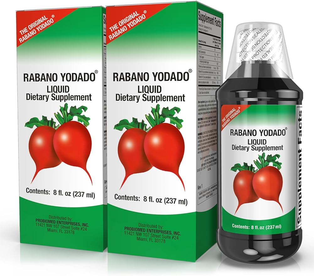 Radish syrup is highly praised for its medicinal properties. It can help to soothe coughs and other respiratory allergies, as well as support thyroid health. Our formula has the main ingredient, horseradish, to enhance your bronchial tract health and clear congestion. Rabano Yodado's other key element is potassium iodide, which helps you support thyroid health and clean out your lymphatic system. Adding Rabano Yodado Liquid to your daily routine will ensure a fortified diet that will strengthen your overall health and well-being. Add a tablespoon of Rabano Yodado liquid supplement to your daily regimen to clean your lymphatic system and stimulate energy. Our formula helps to stimulate the production of energy. And fortified with B vitamins, Rabano Yodado helps to detoxify your body and skin; its power lies in its high concentration of vitamins, compounds, and essential minerals.