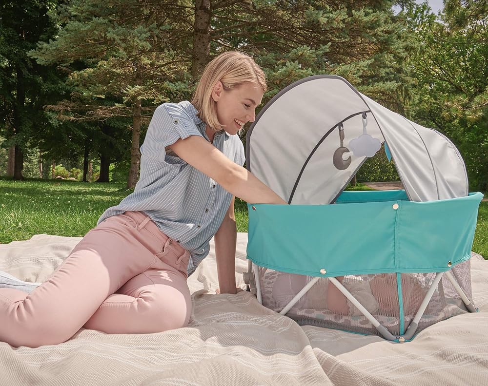 INDOOR AND OUTDOOR: includes a UPF 50 plus canopy for sun protection; Light weight design with carry case for instant portability; Sets up and folds down in seconds; Compactly folds