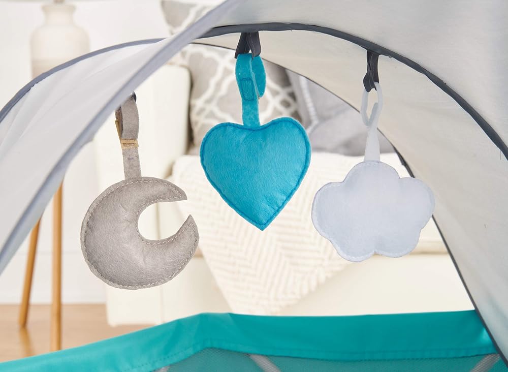 SENSORY: the included toys overhead grab your baby's attention and encourage eye tracking; Includes a moon, heart and cloud that hang from the canopy and are removable