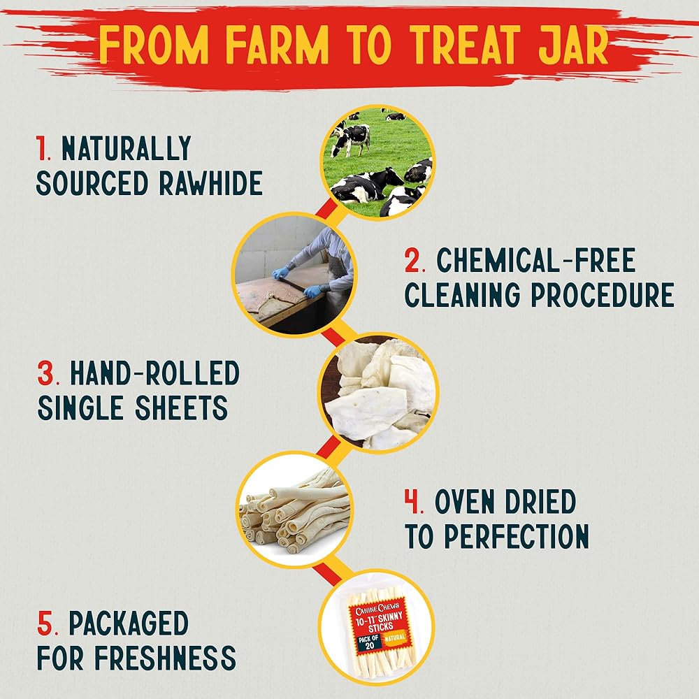 Canine Chews 10-11" Skinny Dog Treats Rawhide Stick Rolls for Small and Medium Aggressive Chewing Dogs will satisfy your aggressive chewer's natural urge to chew. Canine Chews dog bones are made from 100% beef hide, these natural dog chews have a great real meat taste your dog will love! Benefits include skinny rawhide stick roll for aggressive chewers, occupational chewing, dental health, packed with tasty flavor and NEVER FROM CHINA. Dental benefits abound: long-lasting rolls clean teeth and support healthy gums by reducing plaque and tartar through a chewing action. Dental health is a primary focal point for vets with regular treating of occupational chews helping maintain teeth for a long and health life. Ideal for aggressive chewing small dogs, our skinny rawhide stick rolls provide hours of occupational chewing. With incredible value per piece, the rawhide skinny stick pack will last over a week by treating one per day. Canine Chews is preservative-free and manufactured with all natural materials, keeping your dog healthy and happy. Home-safe, our rawhide dog treats are odor free and will not stain carpets or furniture. Packed with real meat flavor your dog will drool over! Our rawhide rolls are single-ingredient all natural rolls made from real beef hide. The savory beef flavor will be sure to keep your dog's attention for hours of chewing fun. Canine Chews rawhide is not considered to be a balanced diet and therefore should not be a primary food source for your dog. Rather, rawhide should be a supplemental dog snack fed at no more than 1 per day. With over 25 years of rawhide manufacturing experience, Canine Chews is vertically integrated and has complete control over the full process of rawhide manufacturing from the beef hide through to your dog. Never from China, our rawhide is hand made in our family-owned factory in Mexico.