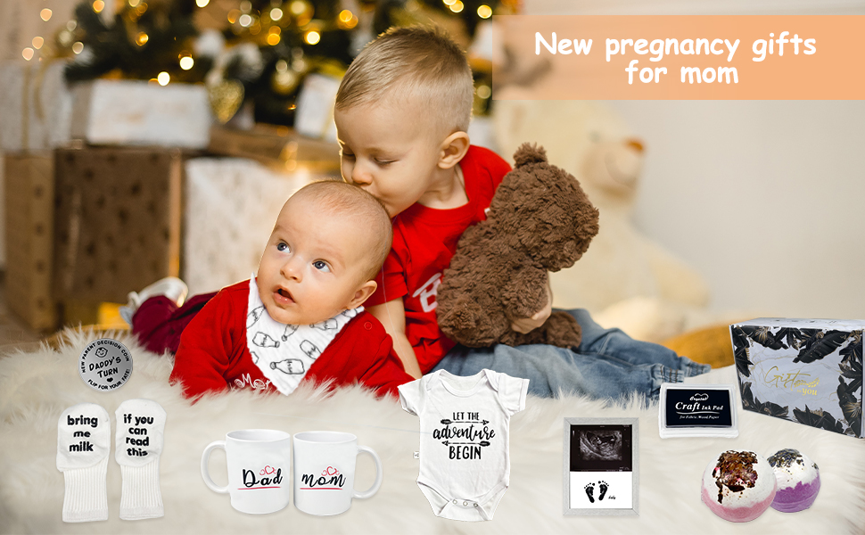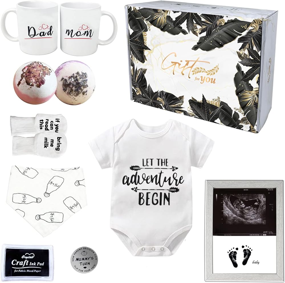 💕NEW MOM GIFTS FOR WOMEN - Are you still struggling with what to give new mom to be gift? This perfect gift set can help. The set includes mom & dad mugs, decision coin, bath bomb, baby picture frame, bibs, onesie, socks, ink pad, it will be expecting parents to be unique gifts.