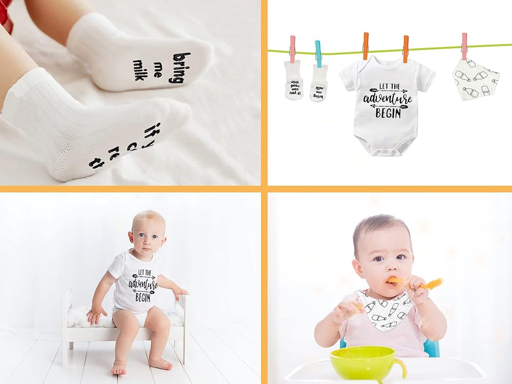 💕NATURAL COTTON BABY ONESIE, BIB & SOCKS - first time parents gifts are baby rompers, soft non-slip socks and bib made of high quality materials Made, breathable and comfortable to help reduce the risk of overheating without irritating a baby's skin. As gender reveal gifts, Every new mom or dad will love this thoughtful first time mom gift.