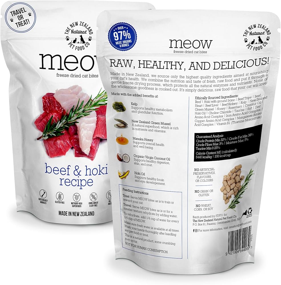 MEOW Lamb & Hoki Freeze Dried Cat Food is made using only the highest quality ingredients aimed at nourishing your pet's health. MEOW combines the nutrition and taste of fresh, raw food by gently freeze-drying to protect all the natural enzymes and nutrients, so none of the wholesome goodness is cooked out. Raw, Natural, and Delicious!