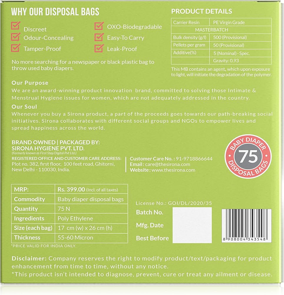 MULTI-UTILITY: These bags are Ideal for Baby Diapers and Baby Wipes, they are also apt for Disposal of Sanitary Pads, Tampons and Panty Liners. They are multi utility bags and can be used for disposal of all sort of waste.