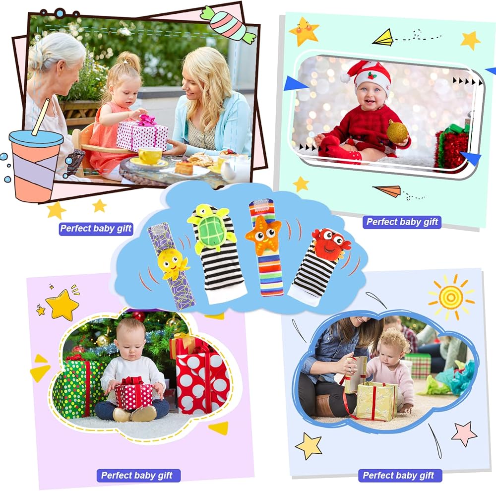🐙🐚 Adorable Design: This baby rattle set includes 2 wrist rattles (starfish & octopus) and 2 foot finder rattle socks (crab & turtle), offering fun and engaging animal-themed toys