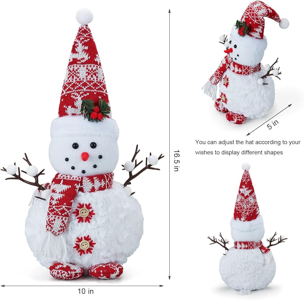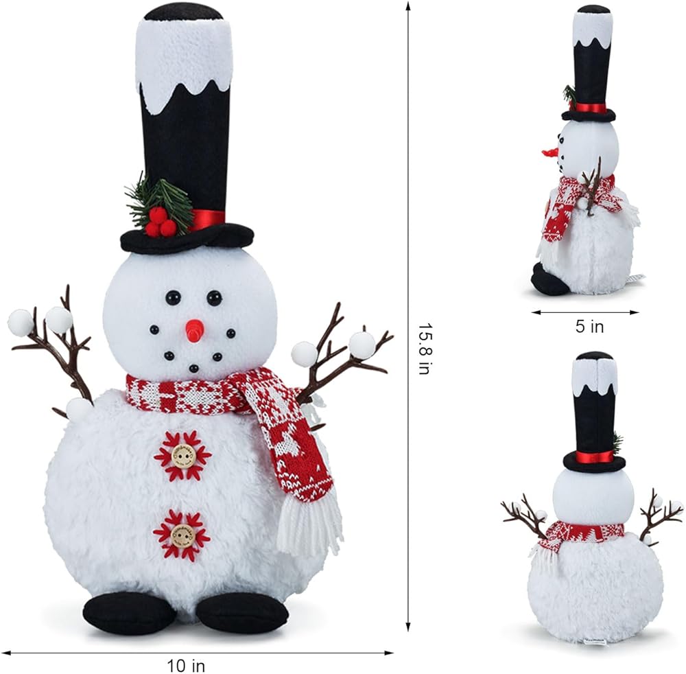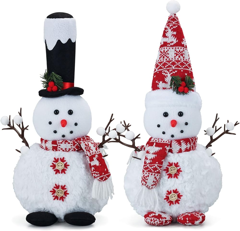 Christmas Snowman Decor: This set of winter snowmen plushes are absolutely adorable.They're very well made and look great.The bases are weighted to keep them upright and the material is really nice.They are medium to large in size and will make for good winter decor.Snowman plush doll is a perfect addition to your home holiday decorating, it will provide a joyous and festive atmosphere.
