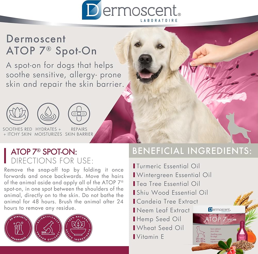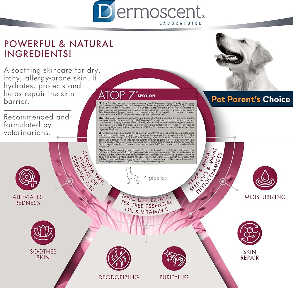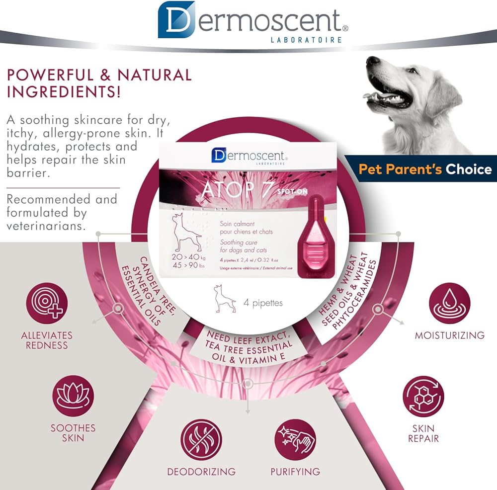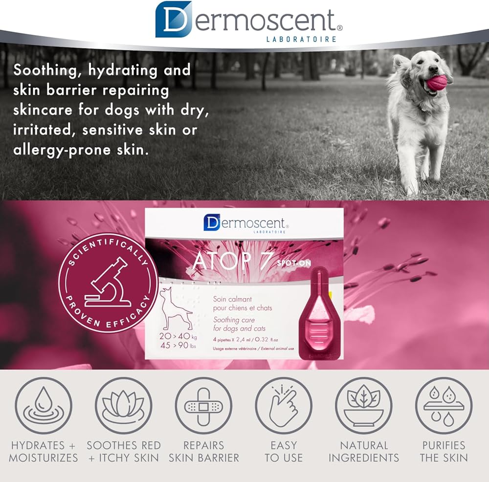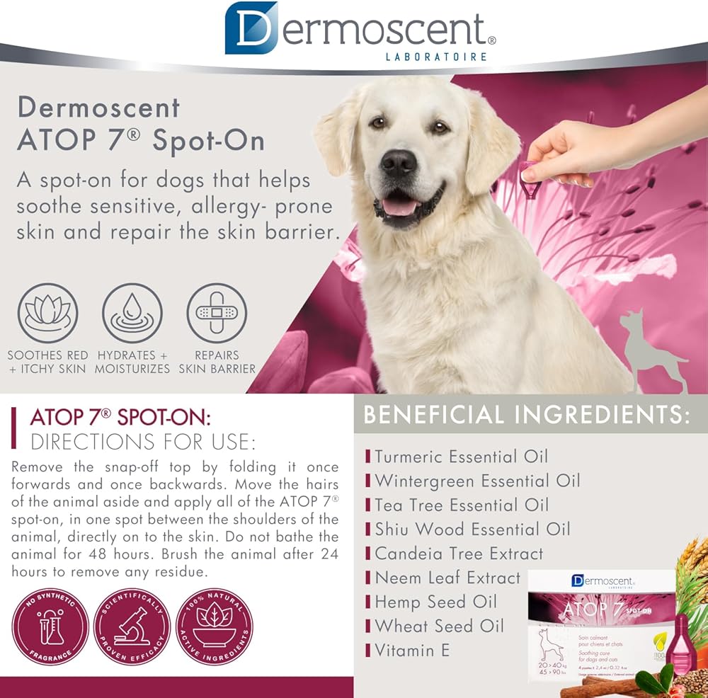 Dermoscent ATOP 7 spot-on - Medium Dogs 22-45 lbs - Soothing Care for Sensitive, Dry and Itchy Skin or Allergy Prone Skin - Natural Ingredients - 4 pipettes